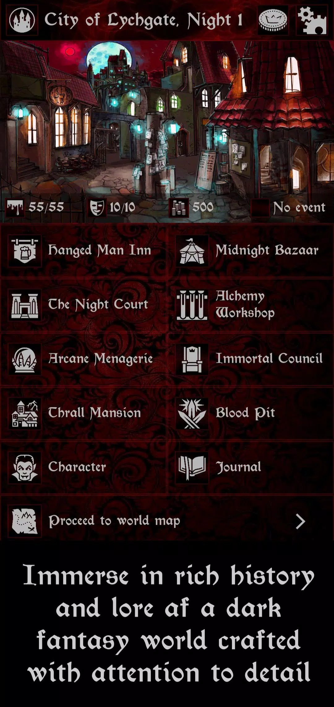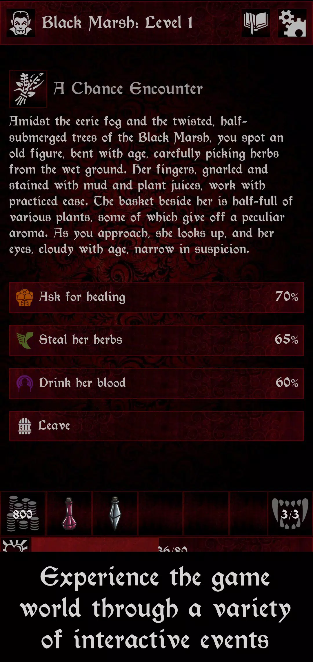 通过沉浸式的文字事件体验互动式故事。你的每一个选择都将塑造你的旅程,游戏灵感源自《龙与地下城》(DnD)和《吸血鬼:避世》(VtM)等经典桌面角色扮演游戏。