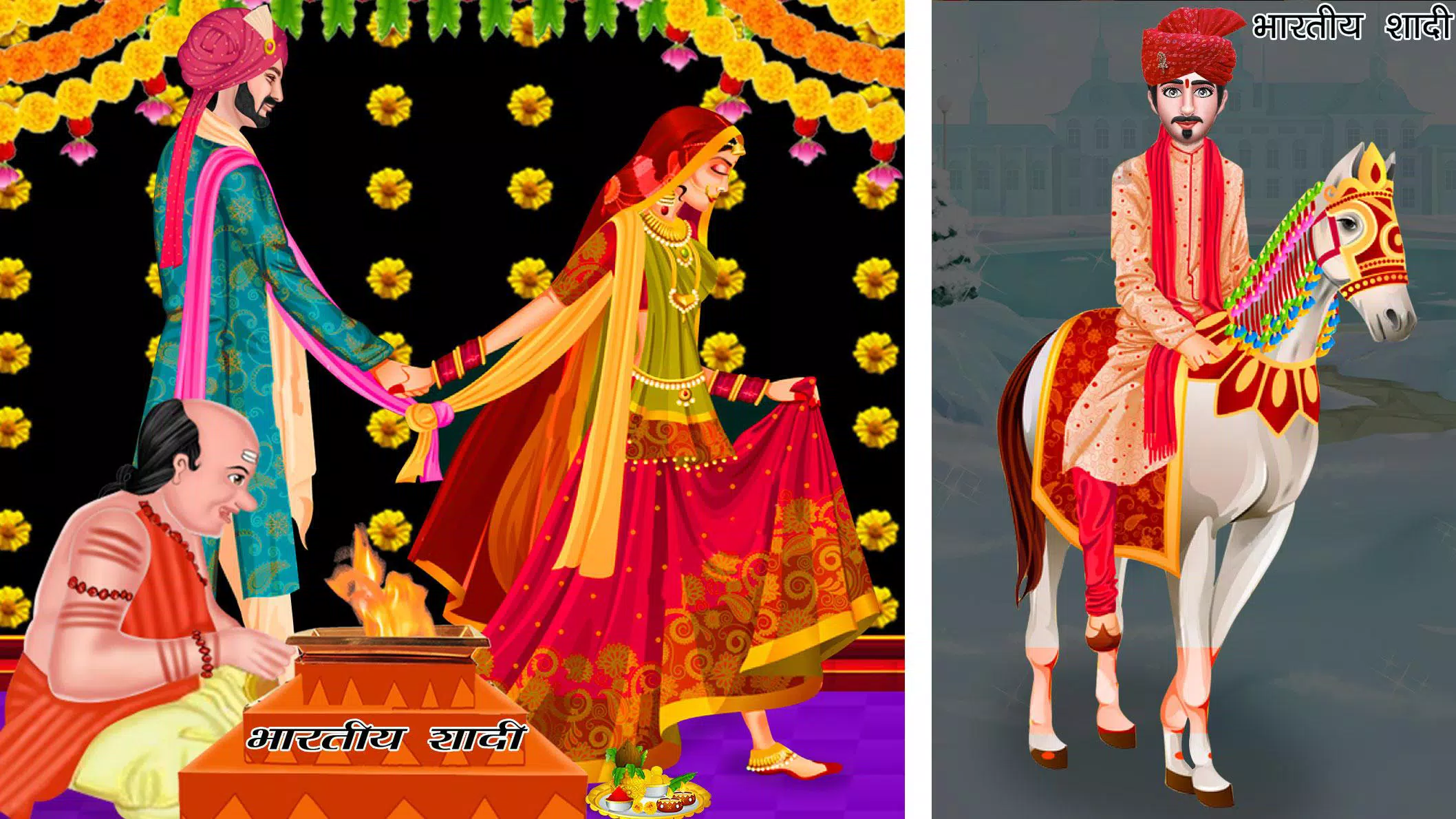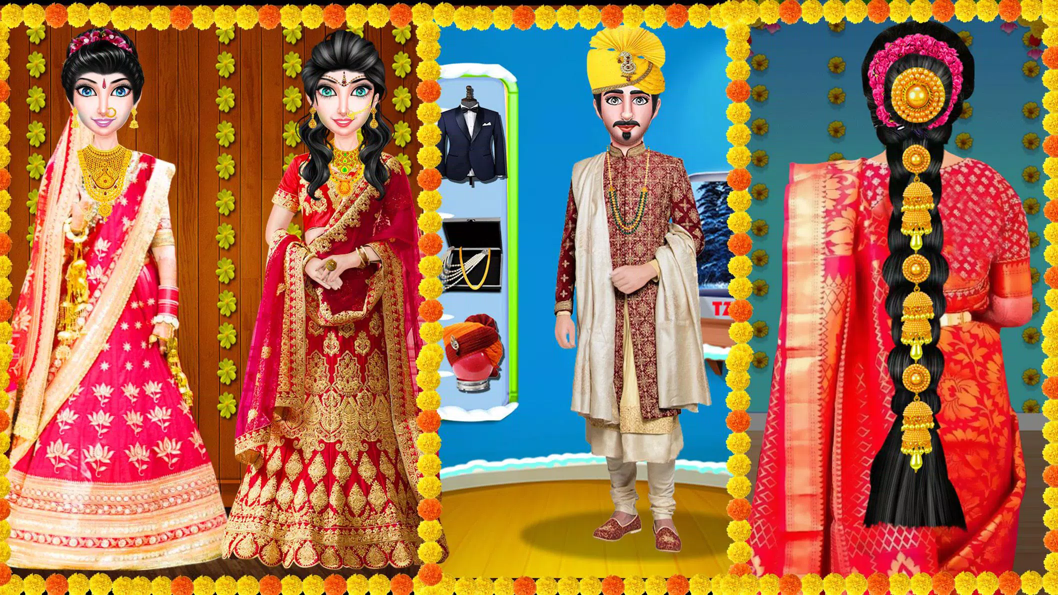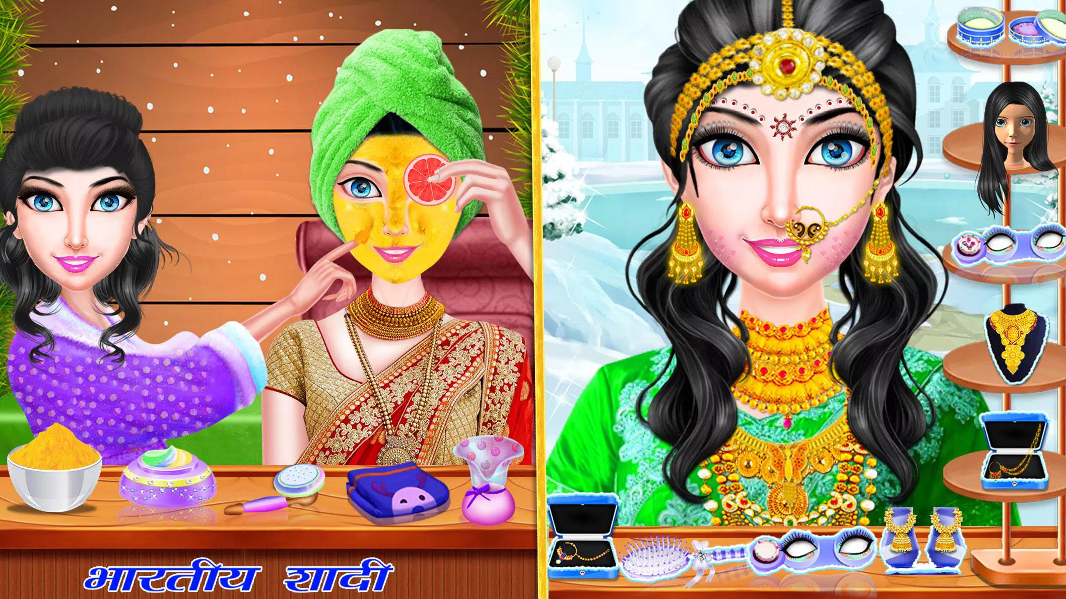 玩皇家印度冬季婚礼包办婚姻/爱情婚姻雪地婚礼游戏,帮助女孩成为新娘,让她的华丽礼服在这寒冷的冬日里看起来光彩夺目。千万不要错过冬季印度婚礼。