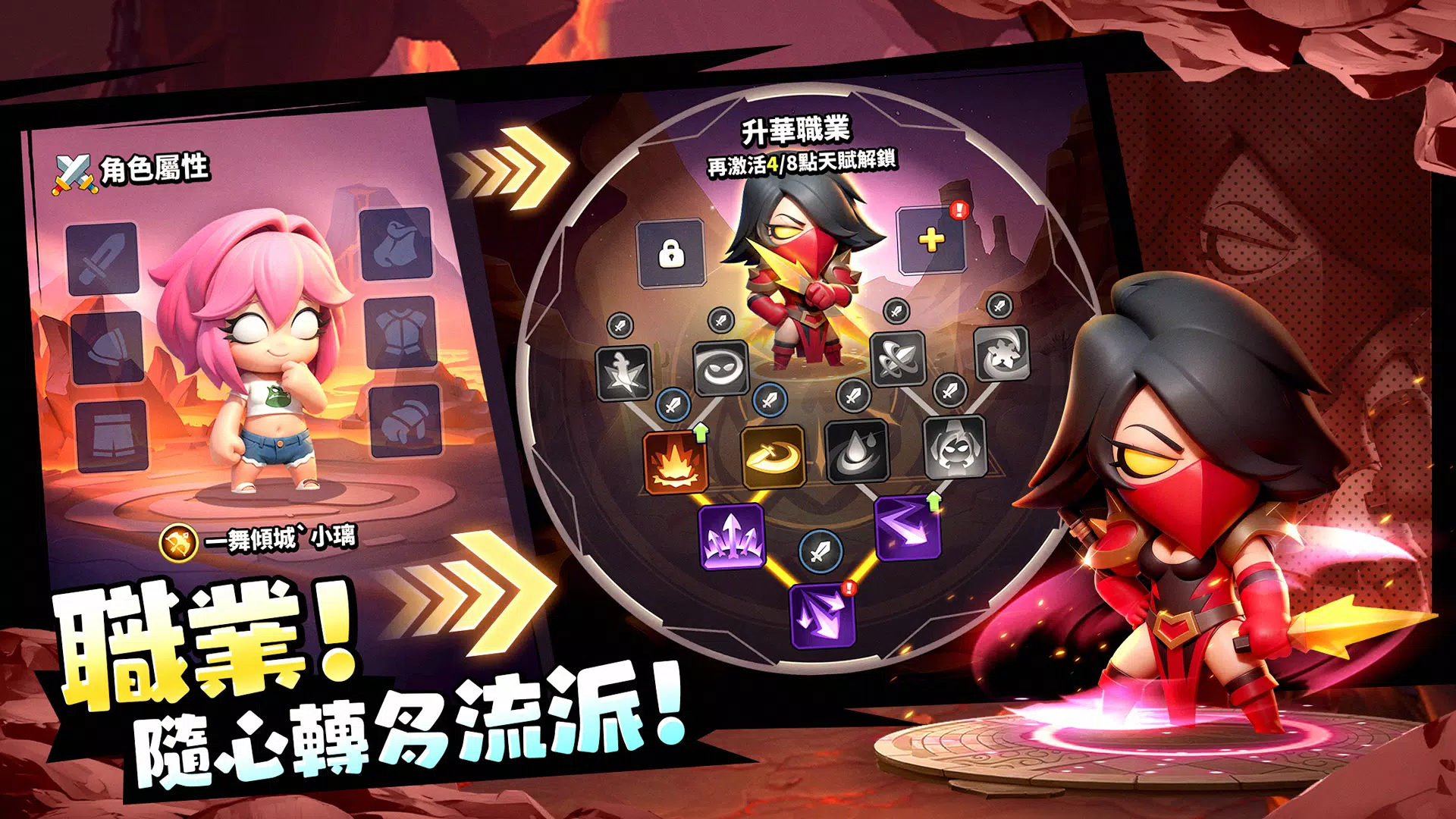 【职业特色】游戏共提供5种不同的职业战士(前排扛伤)、射手(远程物理)、法师(元素掌控)、刺客(高爆发)、牧师(团队辅助),零门槛自由切换职业,并选择学习不同的技能天赋树。