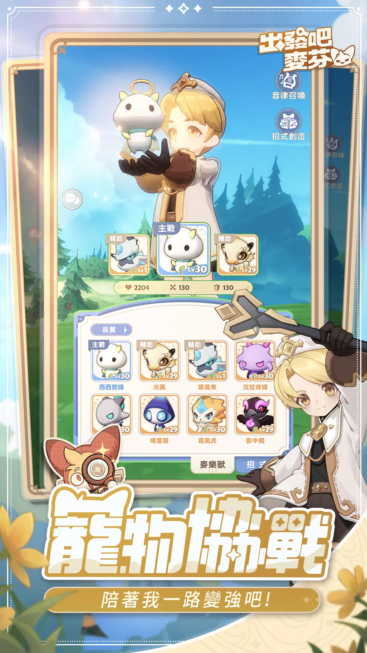 跟我一起融合进化吧,麦乐兽! 《出发吧麦芬》里独特的宠物「麦乐兽」,因冒险家的琴音招唤降生于世,所有麦乐兽都有自己适合的招式,在这可爱就是力量的世界里,麦乐兽不但是你的好伙伴,还能将自身的特殊能力转移到你的身上,让你的冒险更加轻松写意!