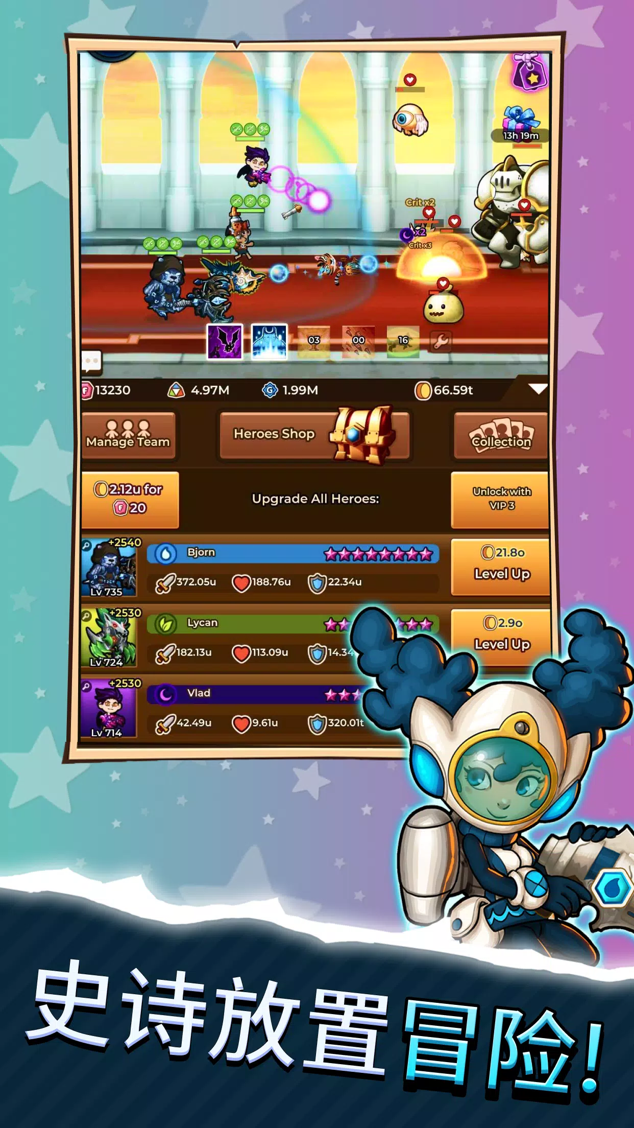 设置好你的英雄,让他们在你离开时战斗。这样,当您返回手机时,他们就会变得更加强大,并收集到大量战利品。
