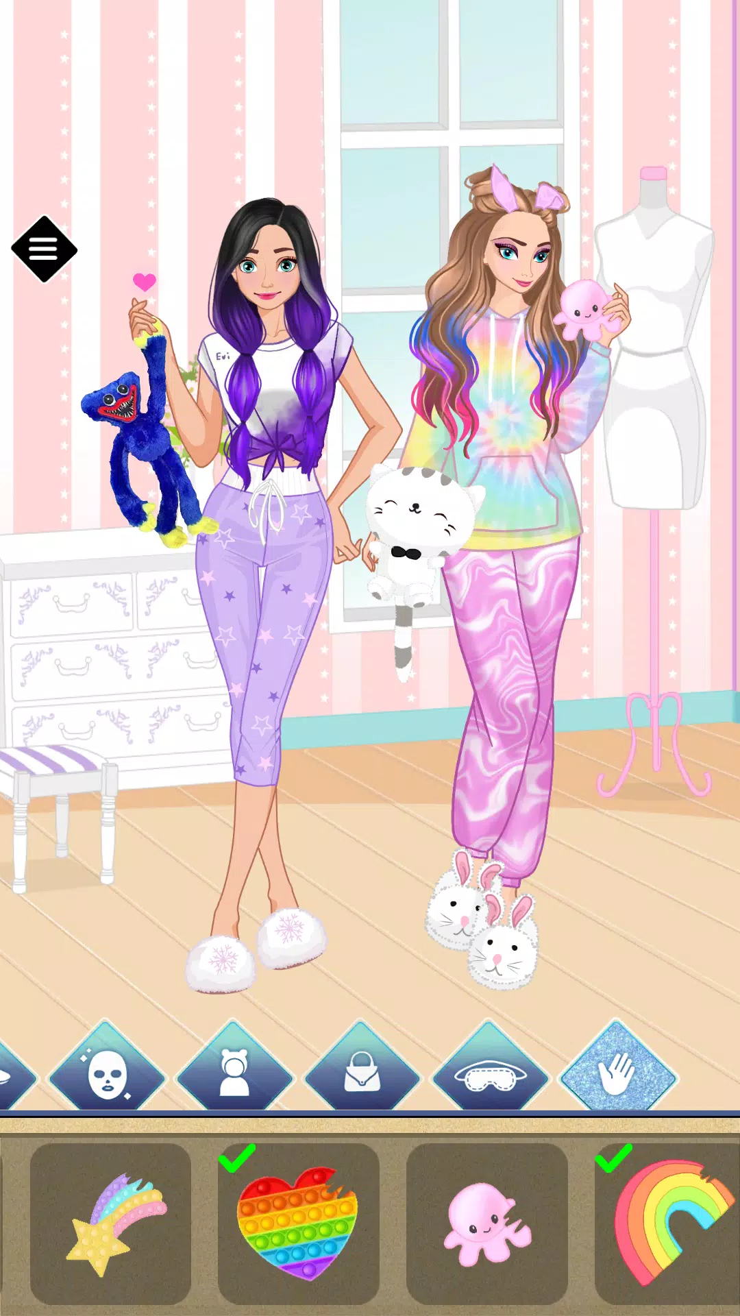 游戏中最后也是最激动人心的阶段是睡衣派对。放学后,最可爱的事情莫过于去朋友家过夜。你可以挑选舒适可爱的熊猫拖鞋或兔子拖鞋、可爱的上衣和短裤,互相设计发型,试穿各种连体衣,还可以制作面膜。