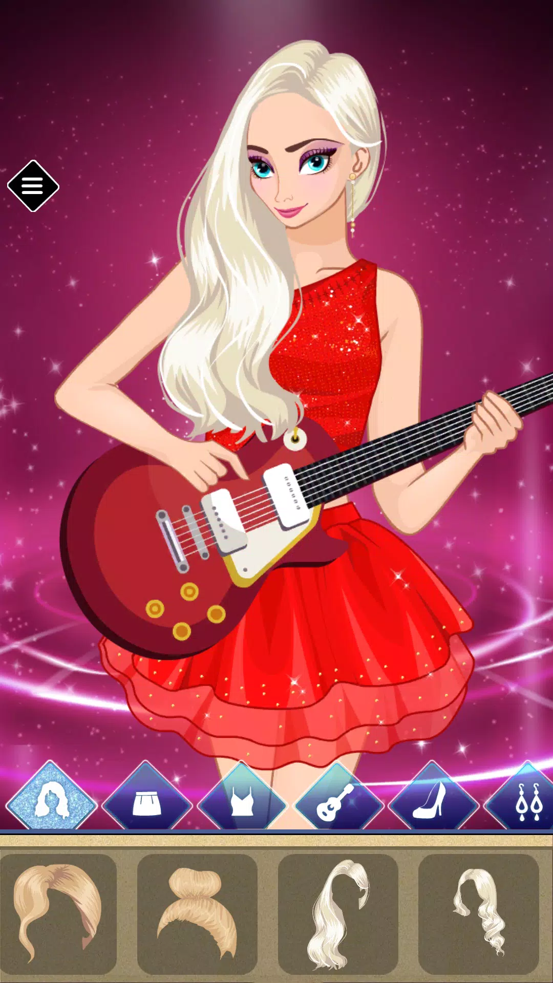 这是一款非同寻常的装扮游戏,你可以在这里找到一些课程,但前提是你必须先去摇滚音乐会现场。为了表演,你需要选择合适的服装、闪亮的裙子、鞋子和独特的发型。当然,摇滚明星必须手握吉他,因为她将演唱她那首动听的歌曲。完成摇滚明星装扮后,你和你的朋友就必须去上学了。是的,我知道学校很无聊,但这所学校完全不同,因为你不用学习,只需要选择服装。每个女生都会对这样的衣橱感到满意!为女朋友挑选服装,为女生挑选服装,打造完美搭配。一定要即兴发挥:配饰、发型、服装——女生装扮游戏会让你心情愉悦,不会感到无聊。