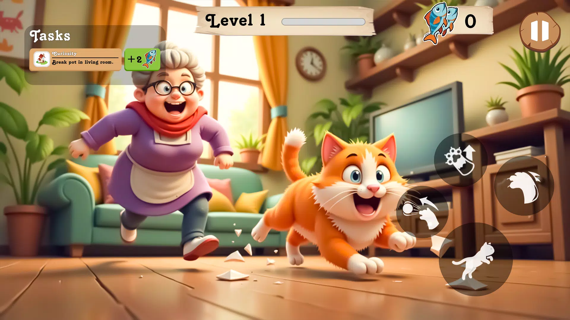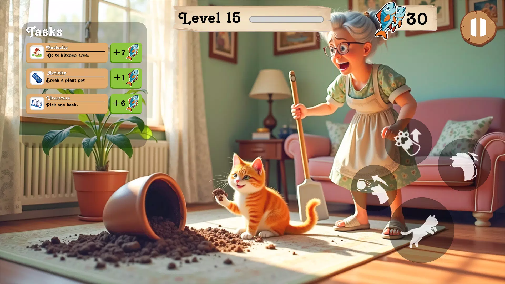 游戏操作简单有趣。摇杆控制移动,长按抓取物品,投掷物品制造混乱,以及跳上家具或架子。所有操作都经过精心设计,让您可以流畅地体验顽皮猫的乐趣。