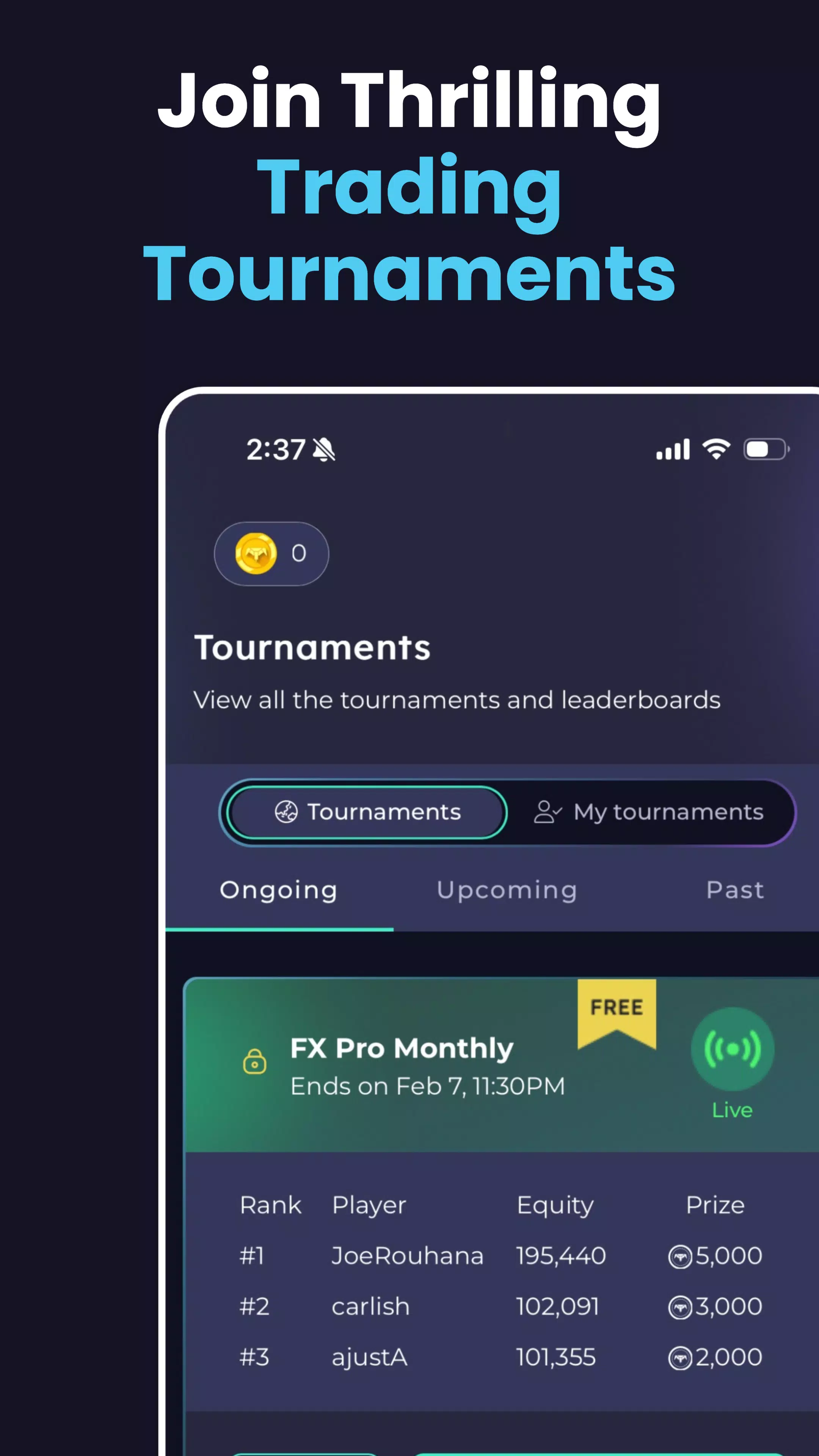 • 参加激动人心的锦标赛:参加根据您的偏好和预算量身定制的免费或付费交易锦标赛,测试您的技能。挑战其他交易员,攀登排行榜,解锁专属特权!