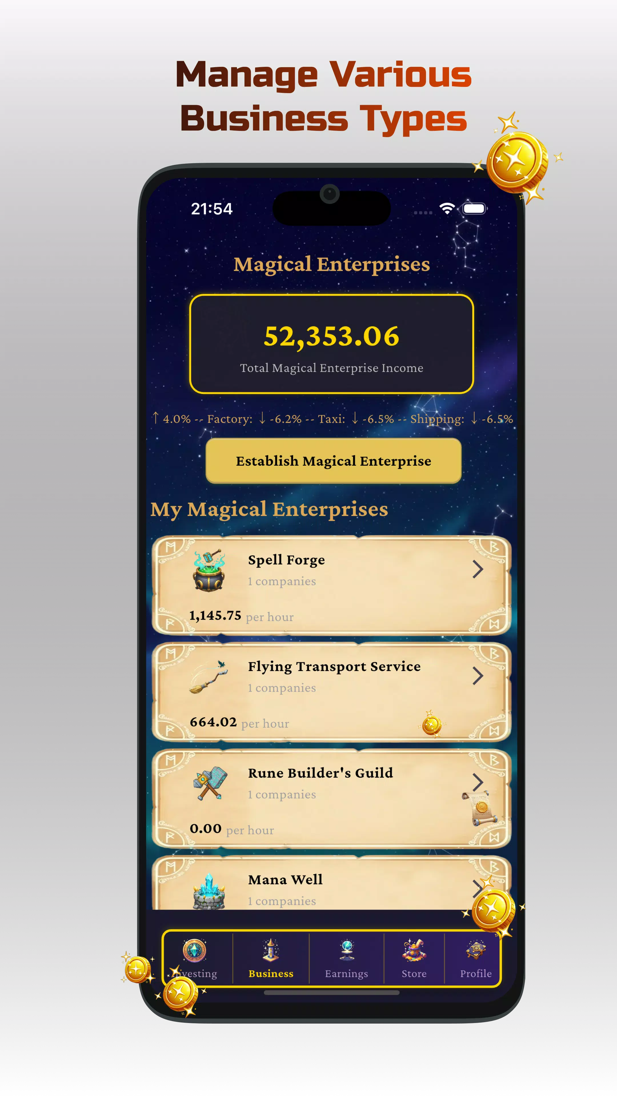 打造你的神秘生意——从药水商店和符文熔炉,到地脉能量枢纽和狮鹫运输行会。每一次点击都让你离成为王国中最富有的巫师更近一步!