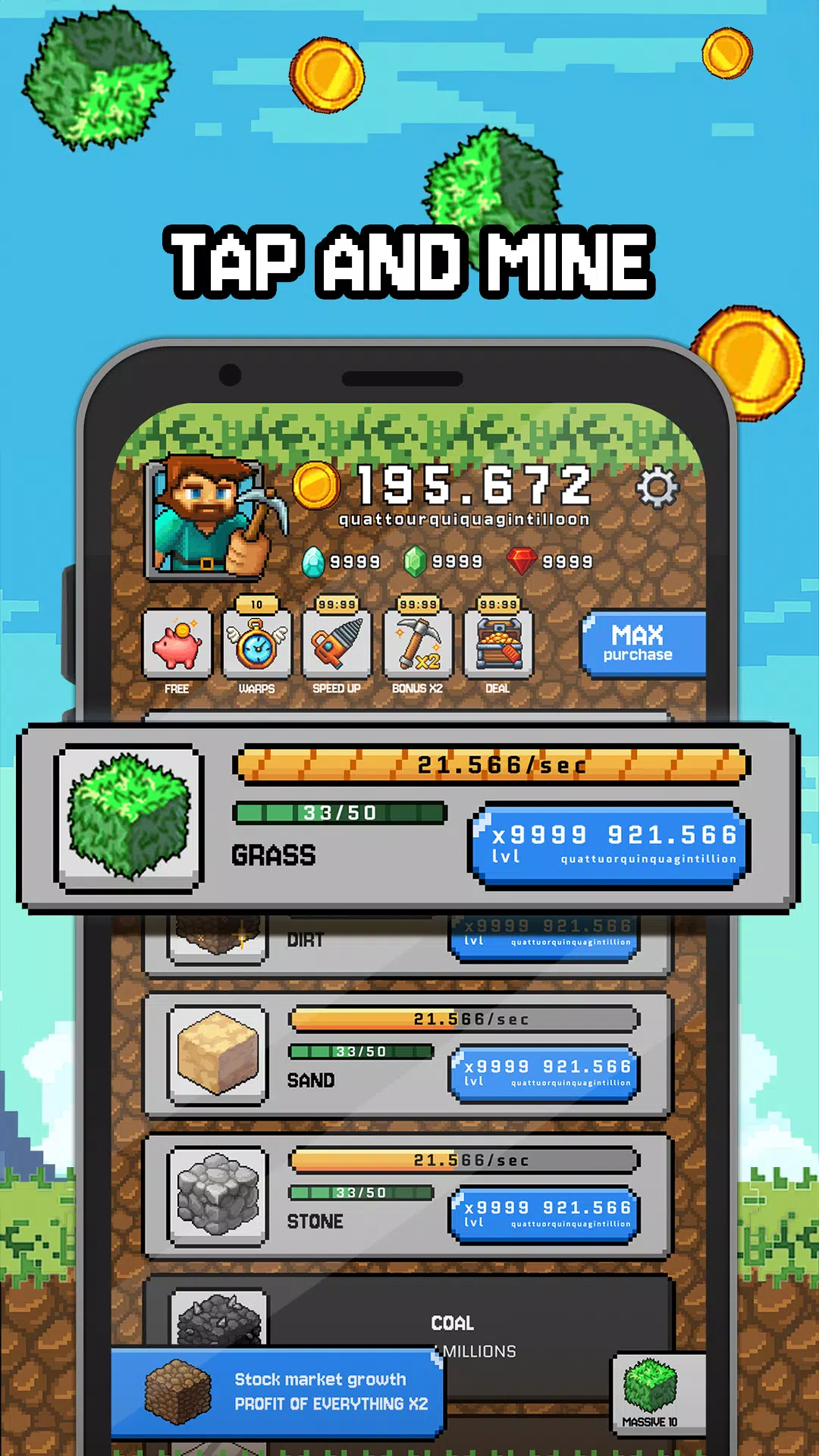 《方块矿工大亨》是一款色彩缤纷的放置点击类大亨游戏,背景设定在一个充满活力的体素世界。点击即可投资,积累财富,并在打造自己的帝国的同时统治方块经济。