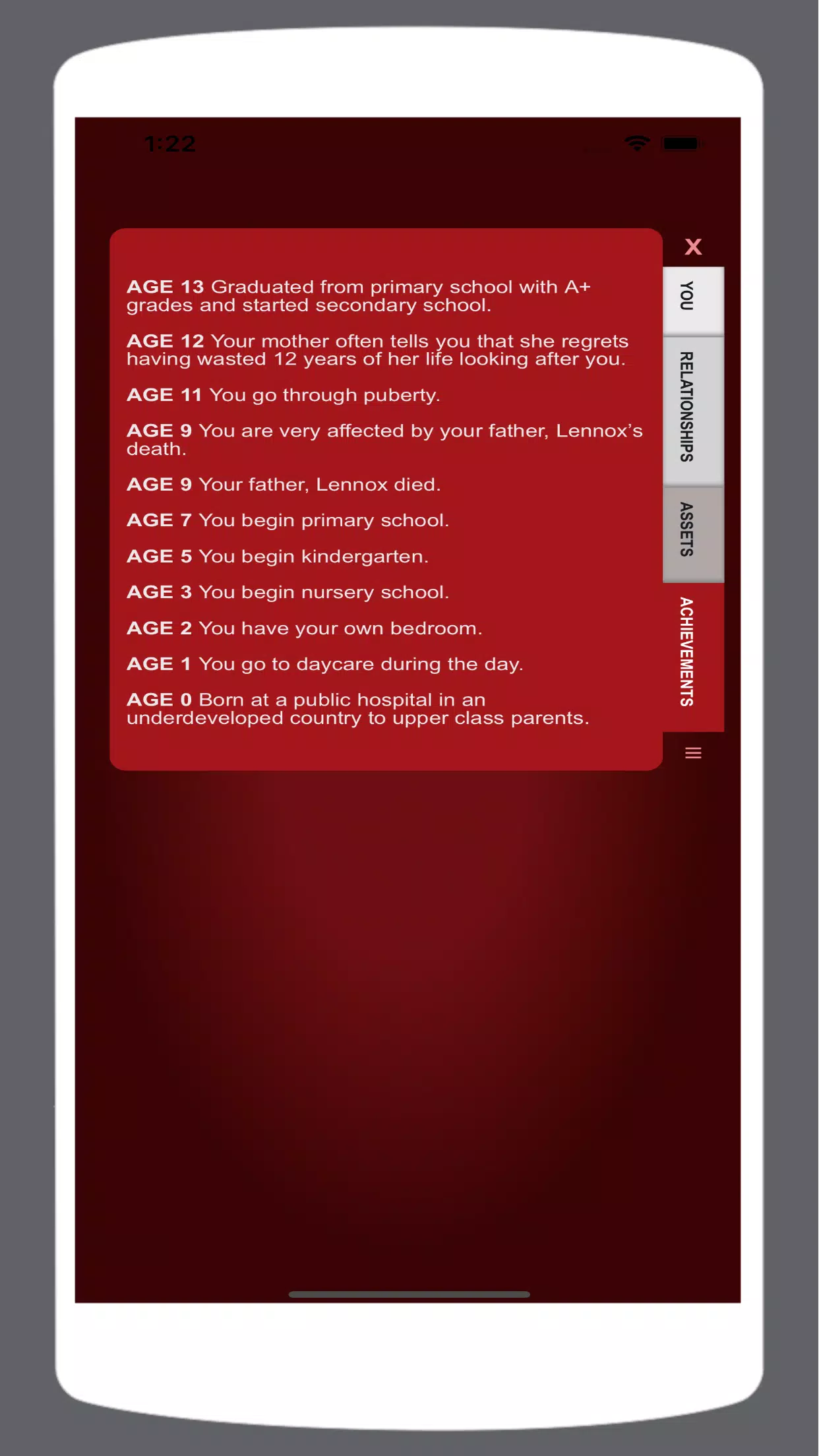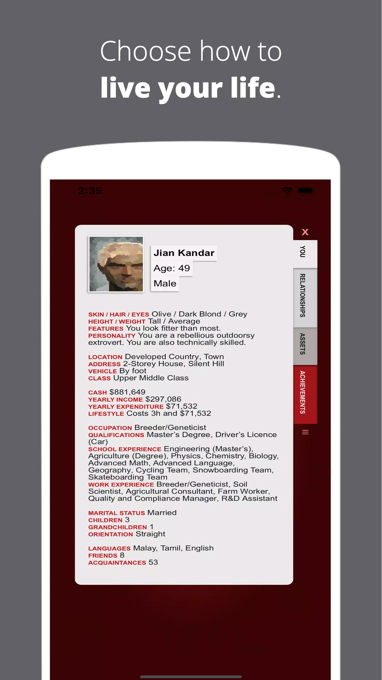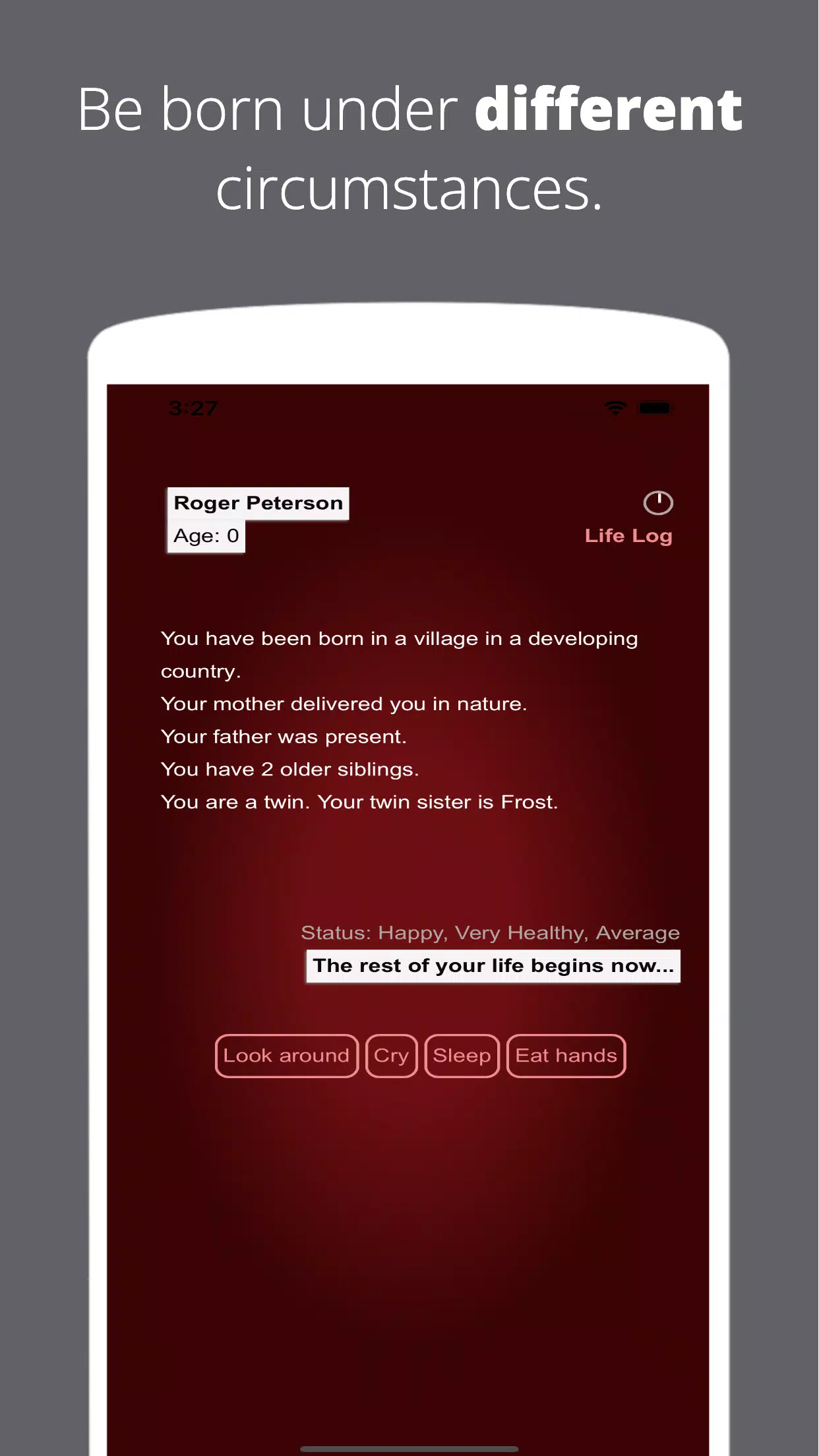 出生在欠发达国家的村庄,或者成为前 1%财富的继承人!受到家人的照顾,或者感受他们绝对讨厌你的感觉。让你的人生故事成为一段美丽的浪漫,或者将你所有的时间都花在发展你的职业生涯上。住在你梦想中的家,或努力摆脱无家可归。生孩子、孙子、曾孙,或者只是挥霍所有的钱来探索生活的所有可能性!