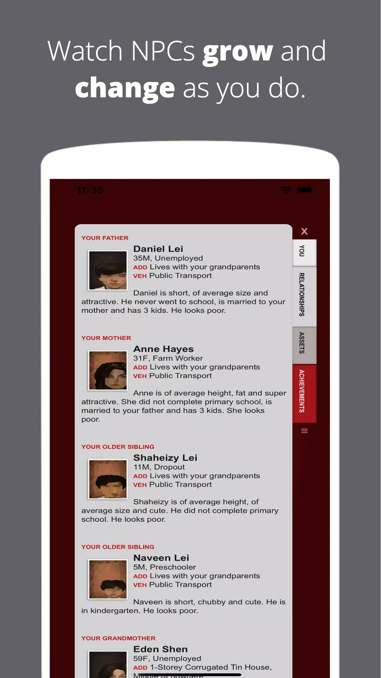 这个开放式生活模拟器包含现实世界的赔率、新颖的故事情节和游戏内时钟,以及与虚拟您一起成长和变化的栩栩如生的 NPC。