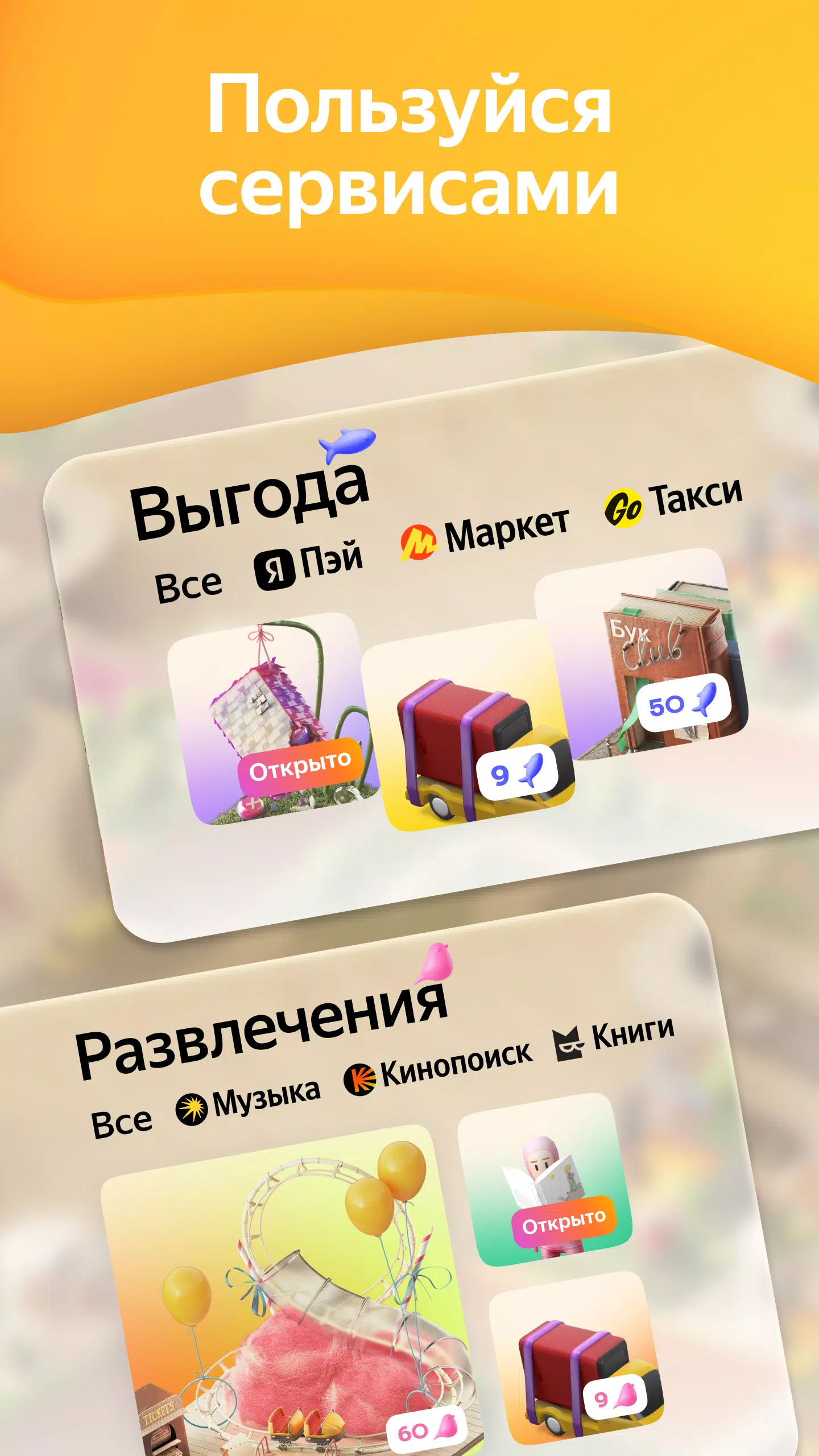 — 在 Kinopoisk 上观看电影和电视剧,在 Yandex Music 上收听曲目和播客,并通过 Yandex 服务中的活动赚取奖金。