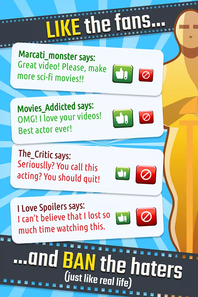🎥 选择你想制作的电影类型:疯狂奇幻片、精妙科幻片、搞笑儿童片、动作片、恐怖片、超级英雄片,甚至太空歌剧!天空没有极限!释放你的创造力,赢得所有观众的青睐!