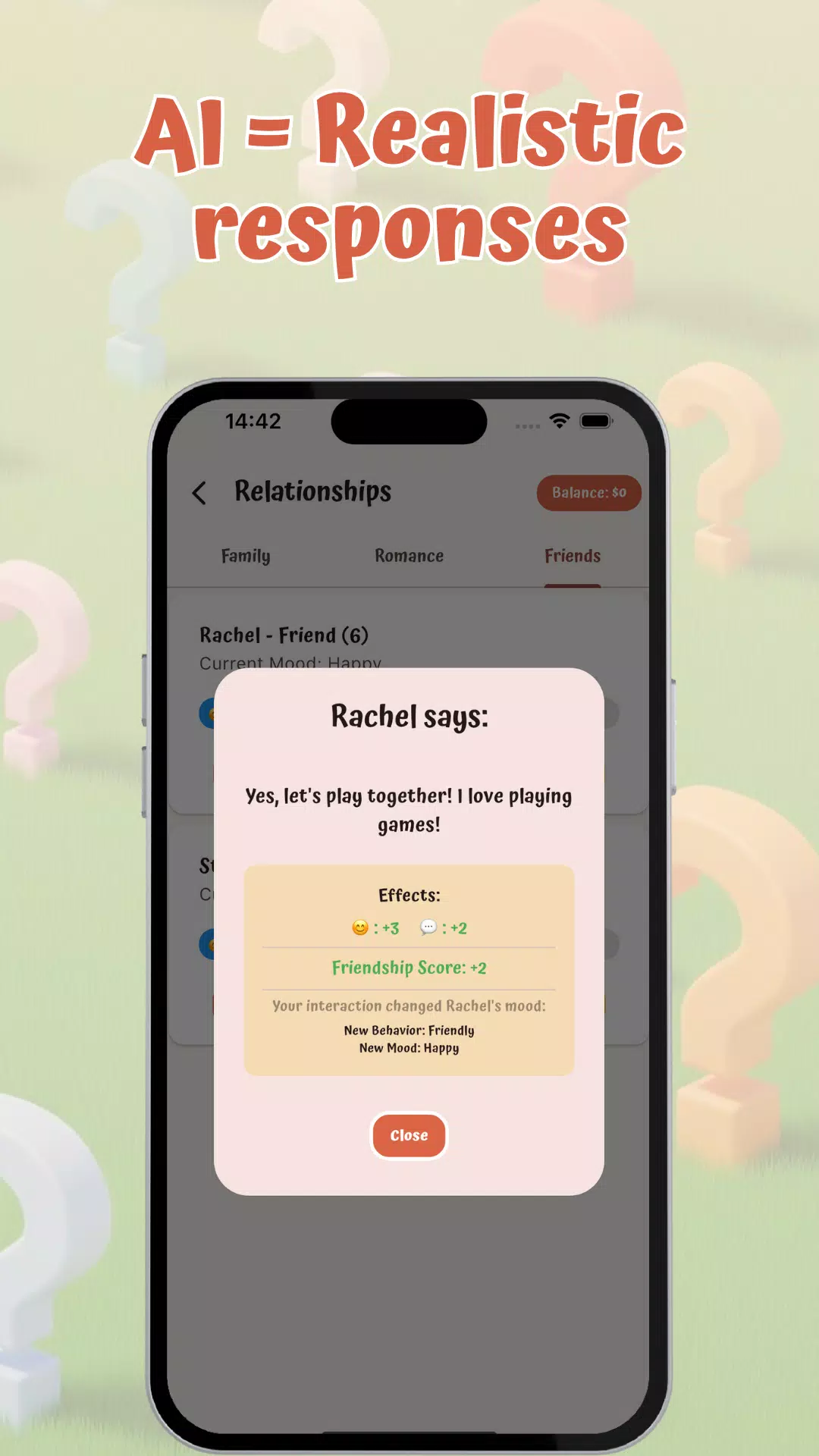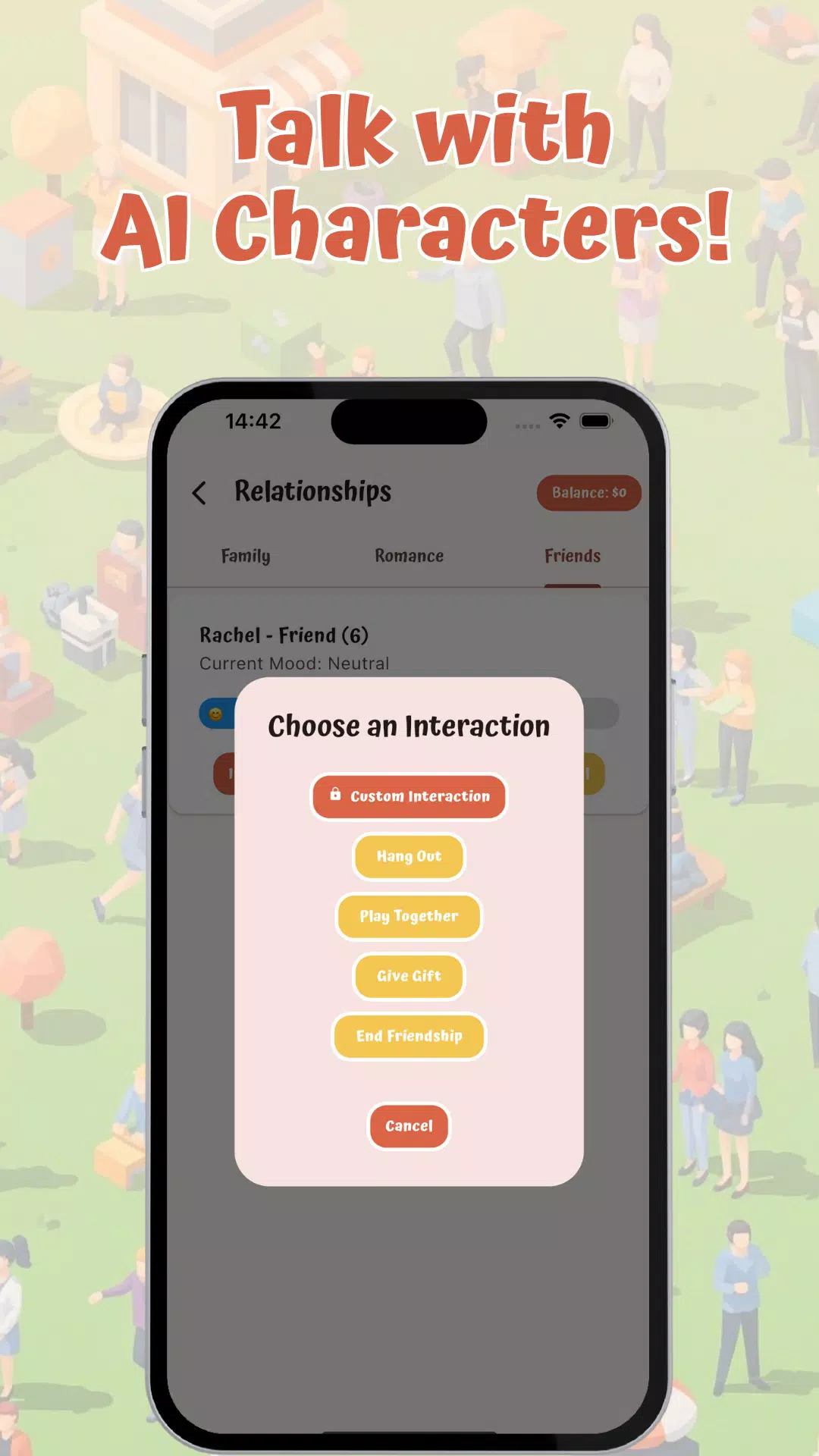 • 人工智能互动:与我们的人工智能聊天机器人和人工智能好友互动,根据你的选择建立人际关系、寻找女朋友/男朋友,甚至步入婚姻殿堂。