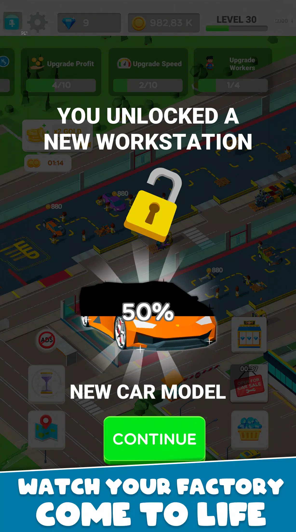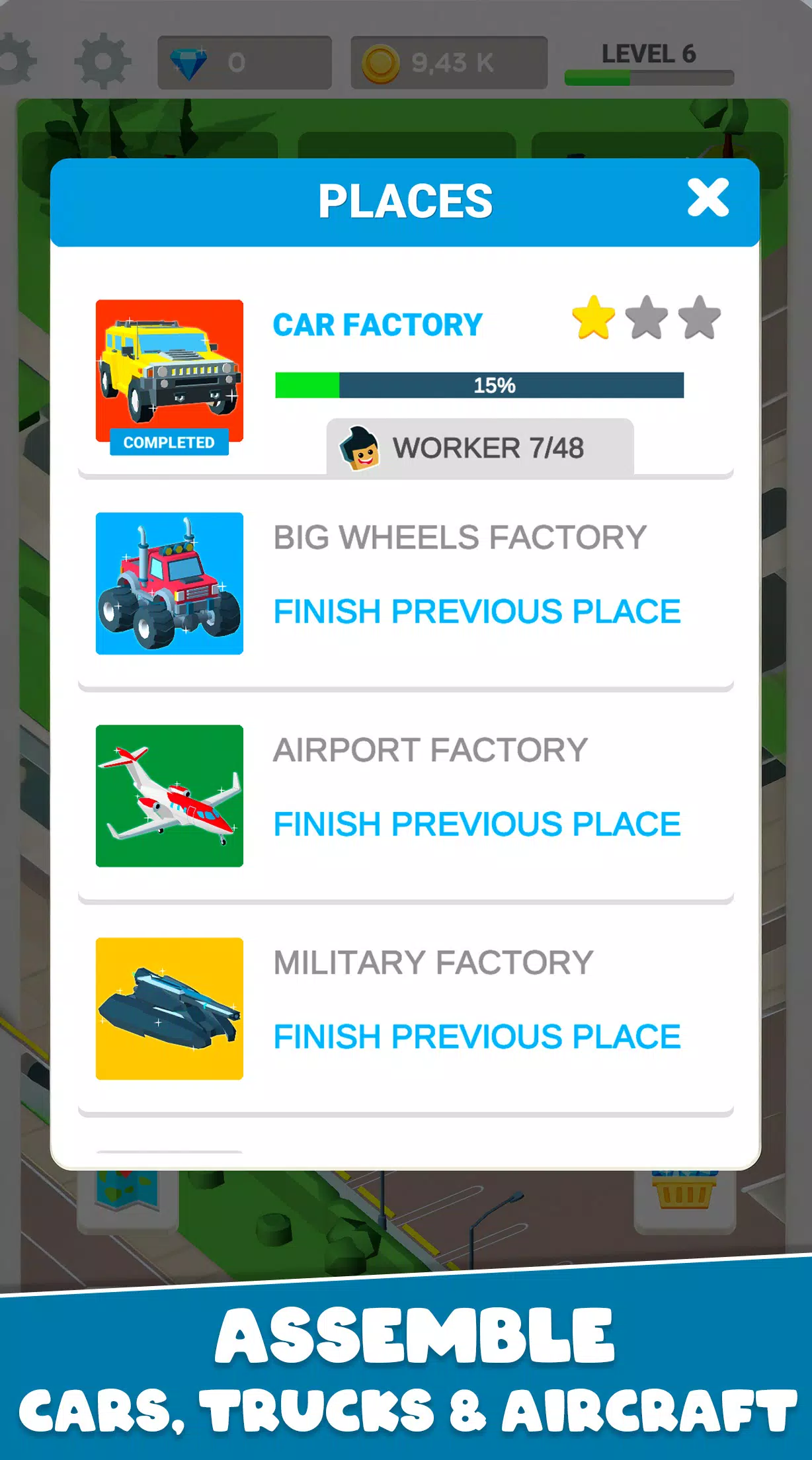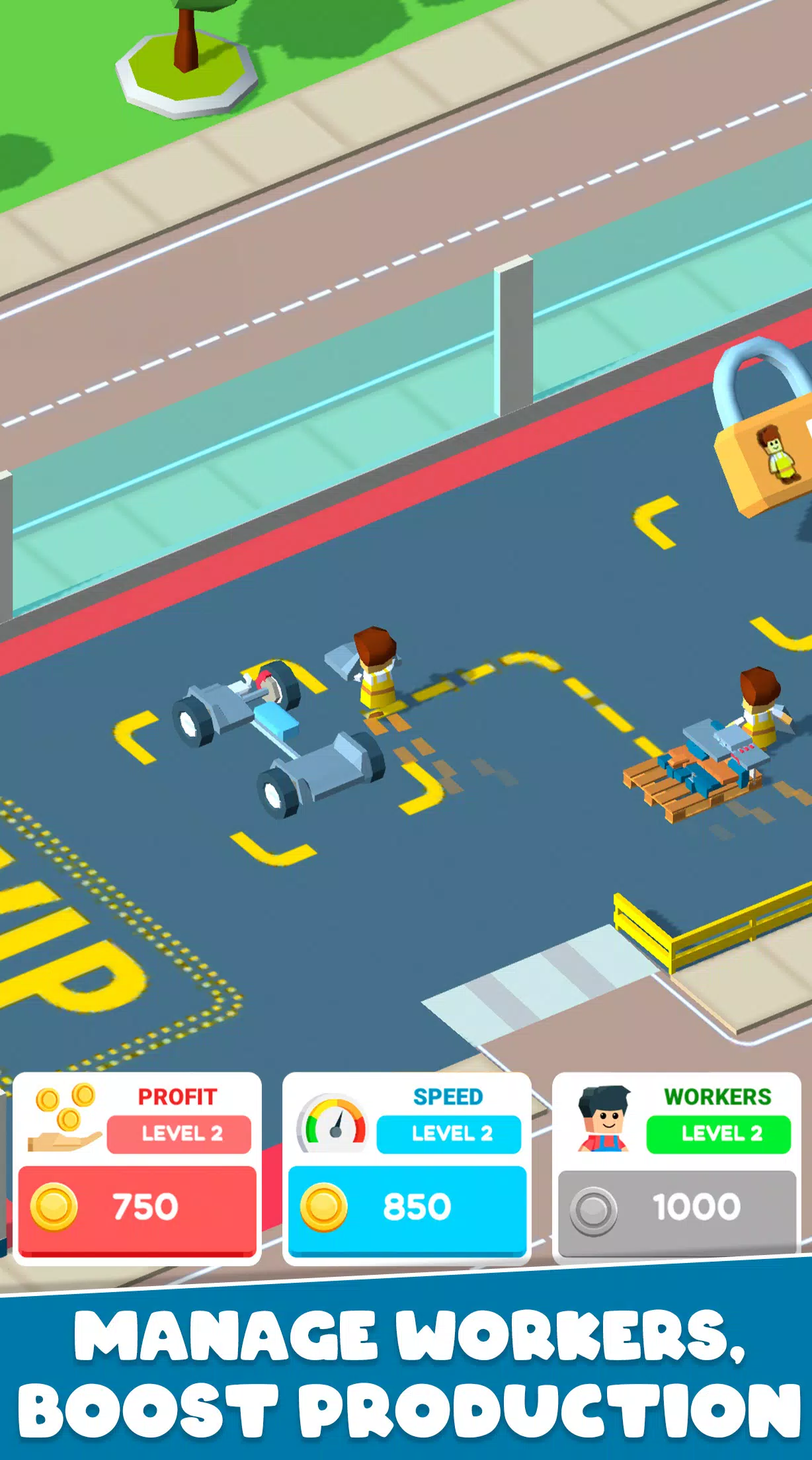 从简陋的修理厂起步,修理汽车,升级工具。扩大生产规模,雇佣工人,解锁更强大的机械,包括巨型卡车、飞机和坦克。