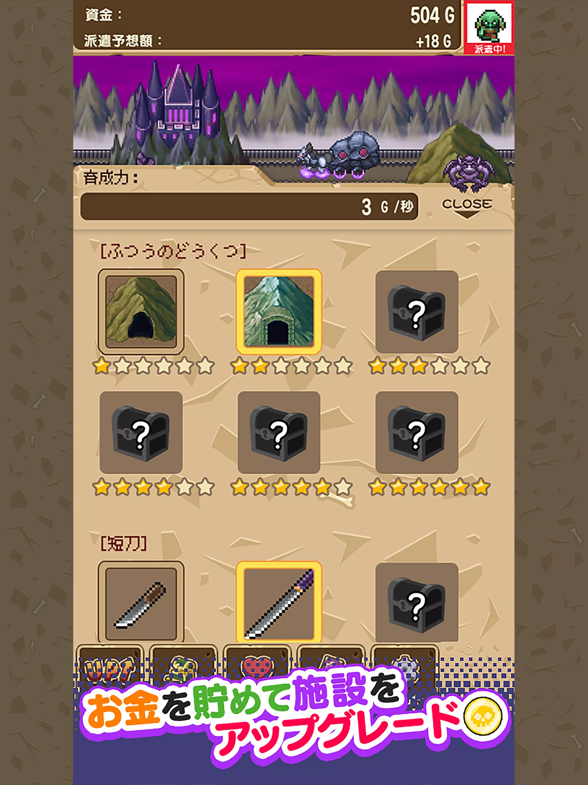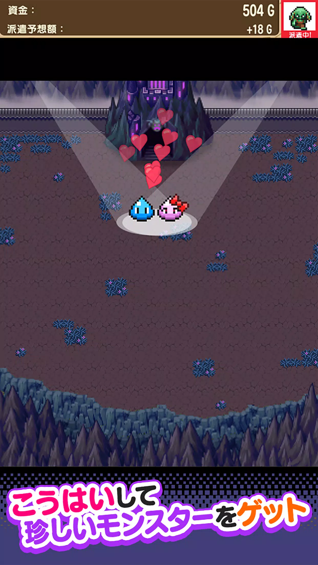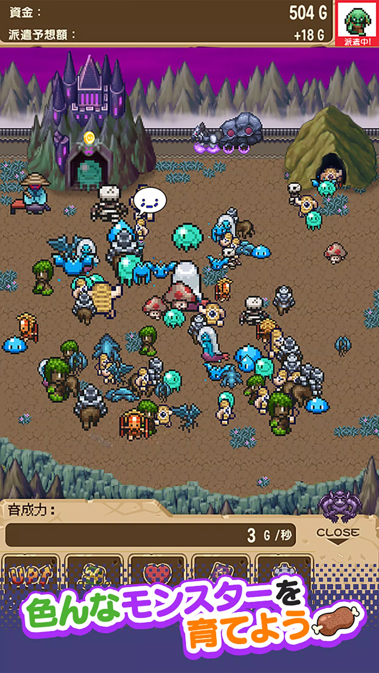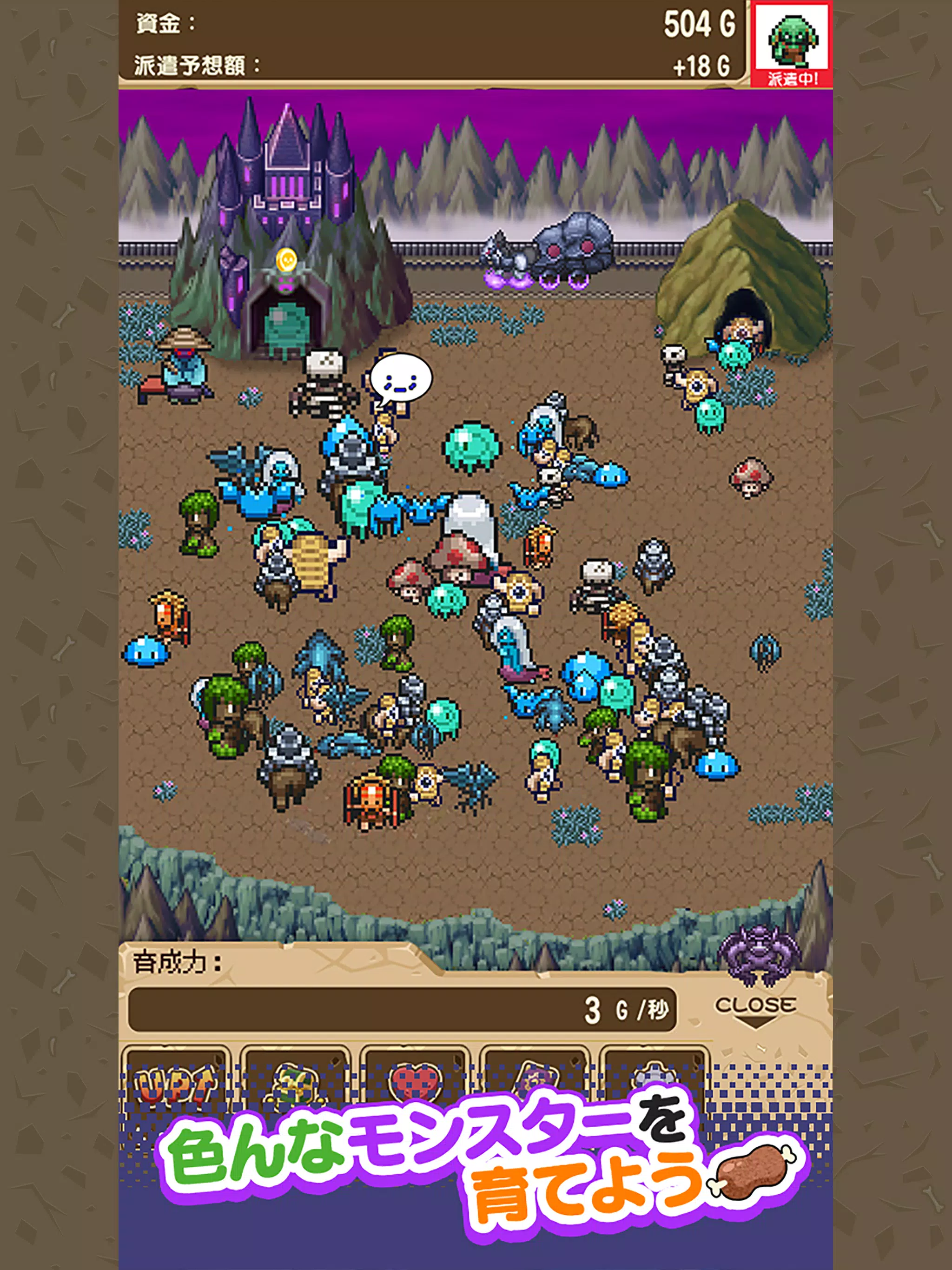 通过触摸和喂养从洞窟出来的魔物,让它们进入魔王城,点击马车将它们送往地牢!