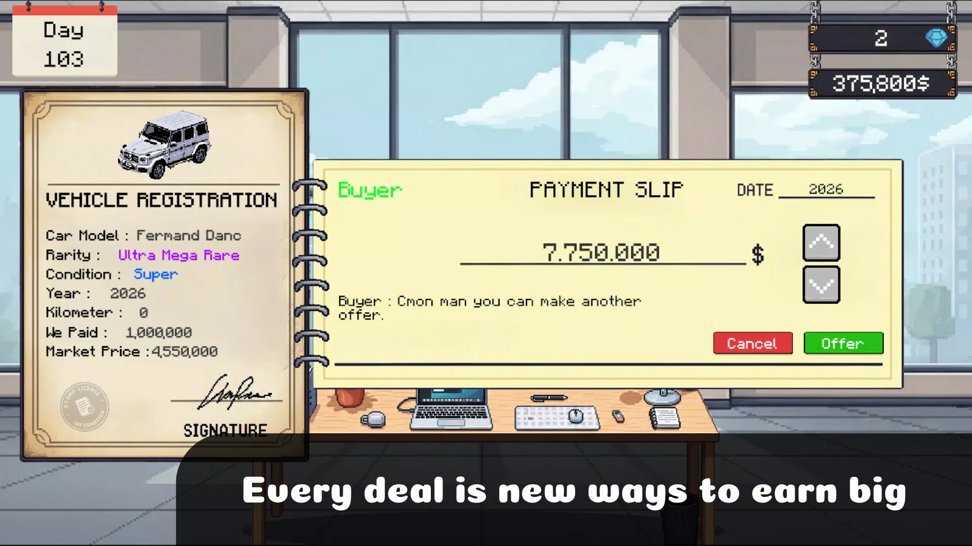 体验汽车交易的刺激!建立你自己的经销店,买卖数百辆汽车,管理你的员工,智胜你的竞争对手。凭借逼真的游戏机制和无限的机遇,这款模拟游戏将助你成为真正的汽车帝国大亨!