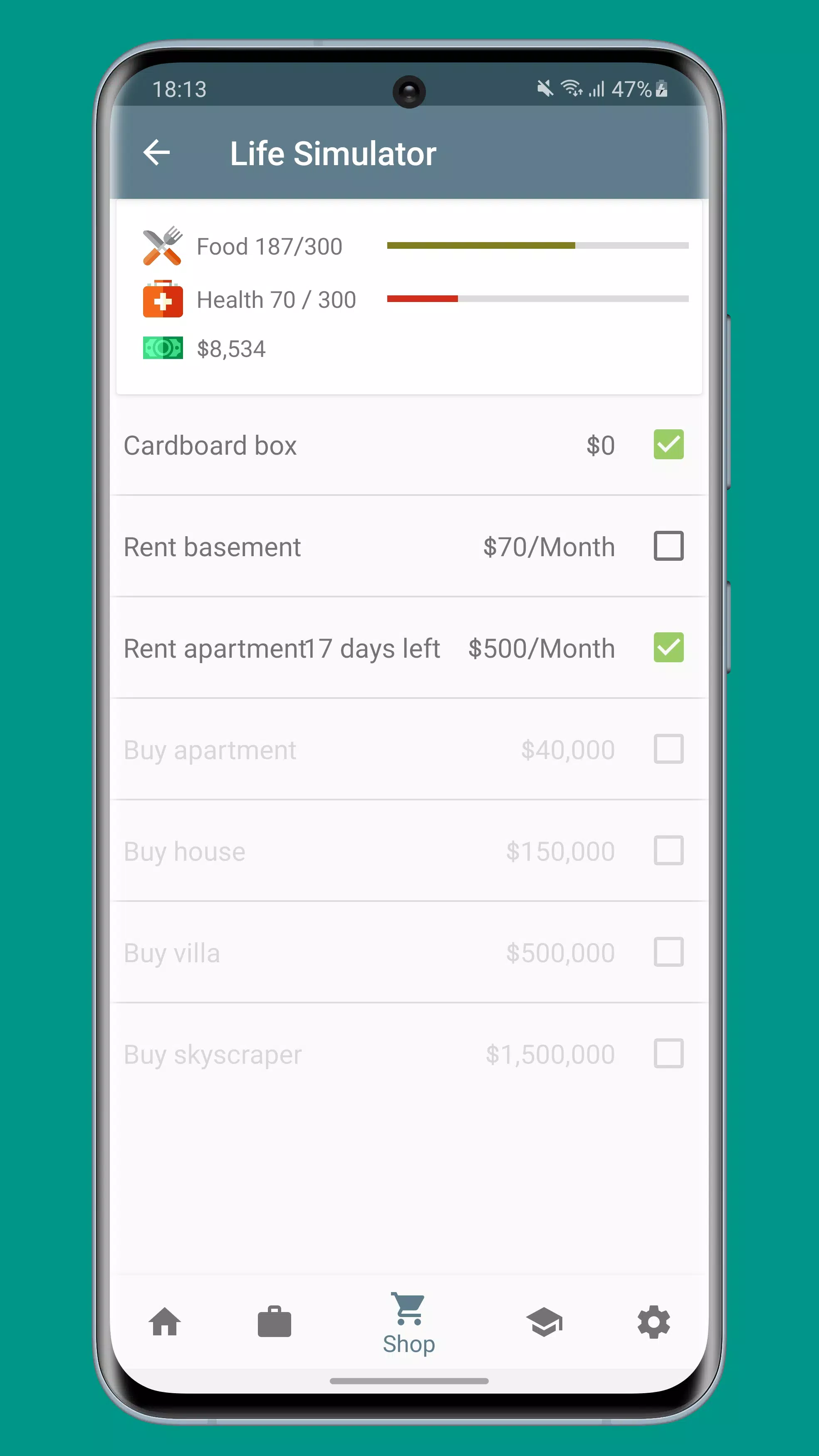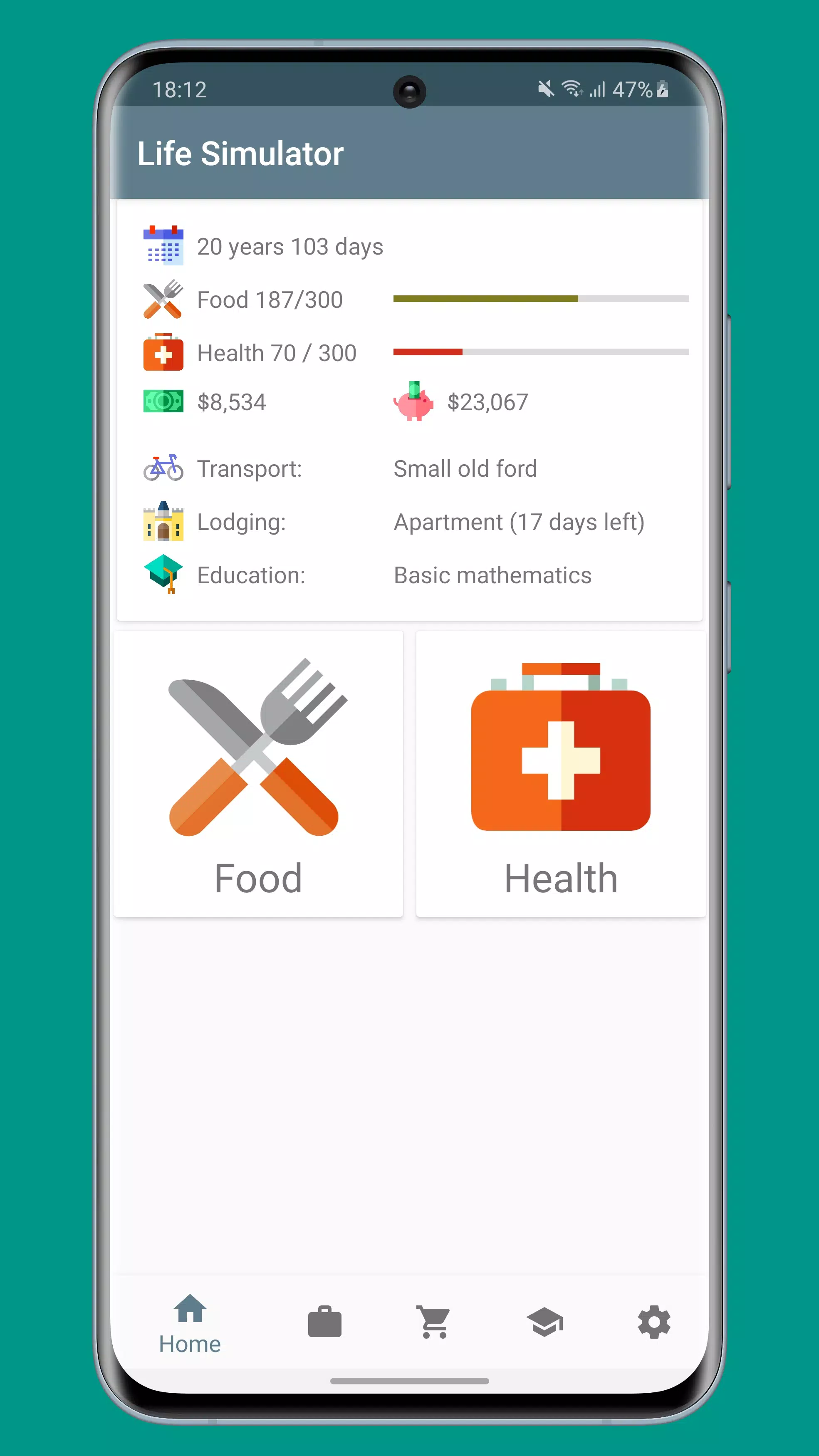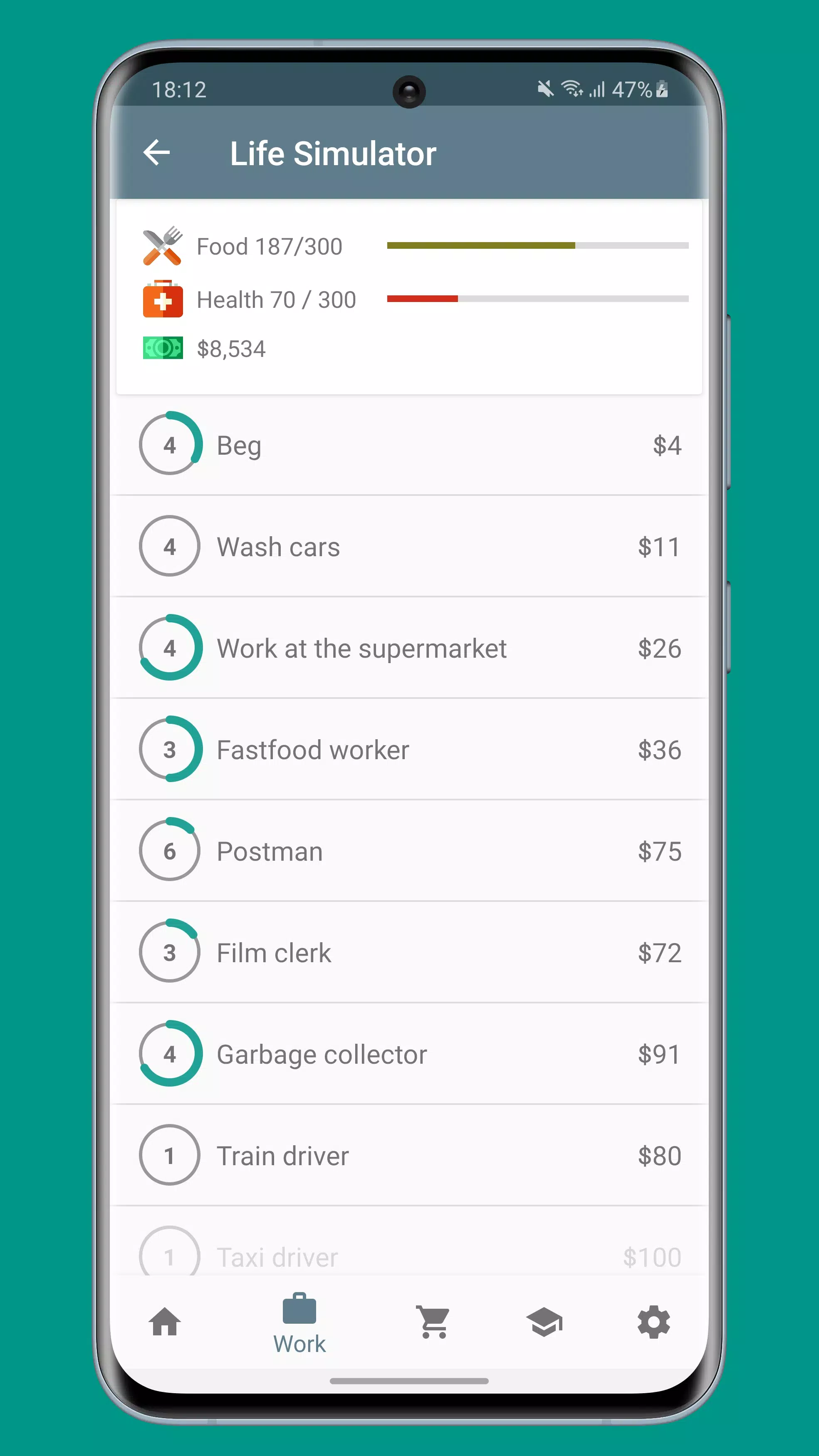 你赤脚流落街头,身无分文。你的工作就是赚钱,无论好坏。开始赚钱用于教育或在商店购买其他物品。通过做得更好来赚取更多钱。慢慢攀登成功的阶梯。注意饮食和健康,否则就会丧命。