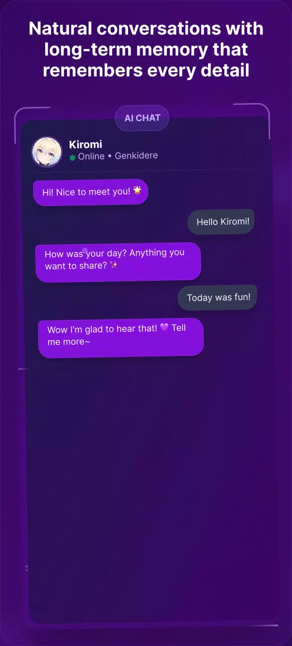 从傲娇、病娇等多种性格类型中进行选择。我们的 AI 拥有长期记忆,可以记住之前的聊天记录,让每一次对话都更有意义。