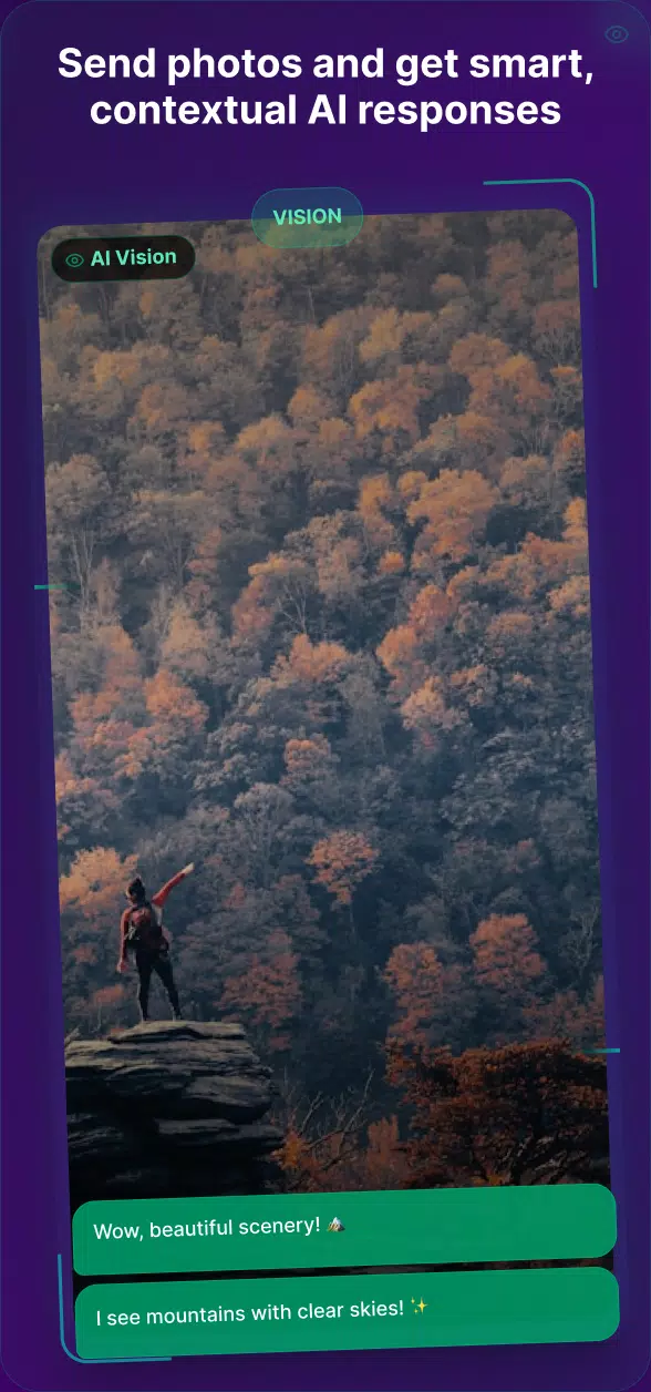 与你的虚拟朋友分享你的世界!发送食物、风景或日常活动的照片,你的 AI 助手会实时识别并评论。