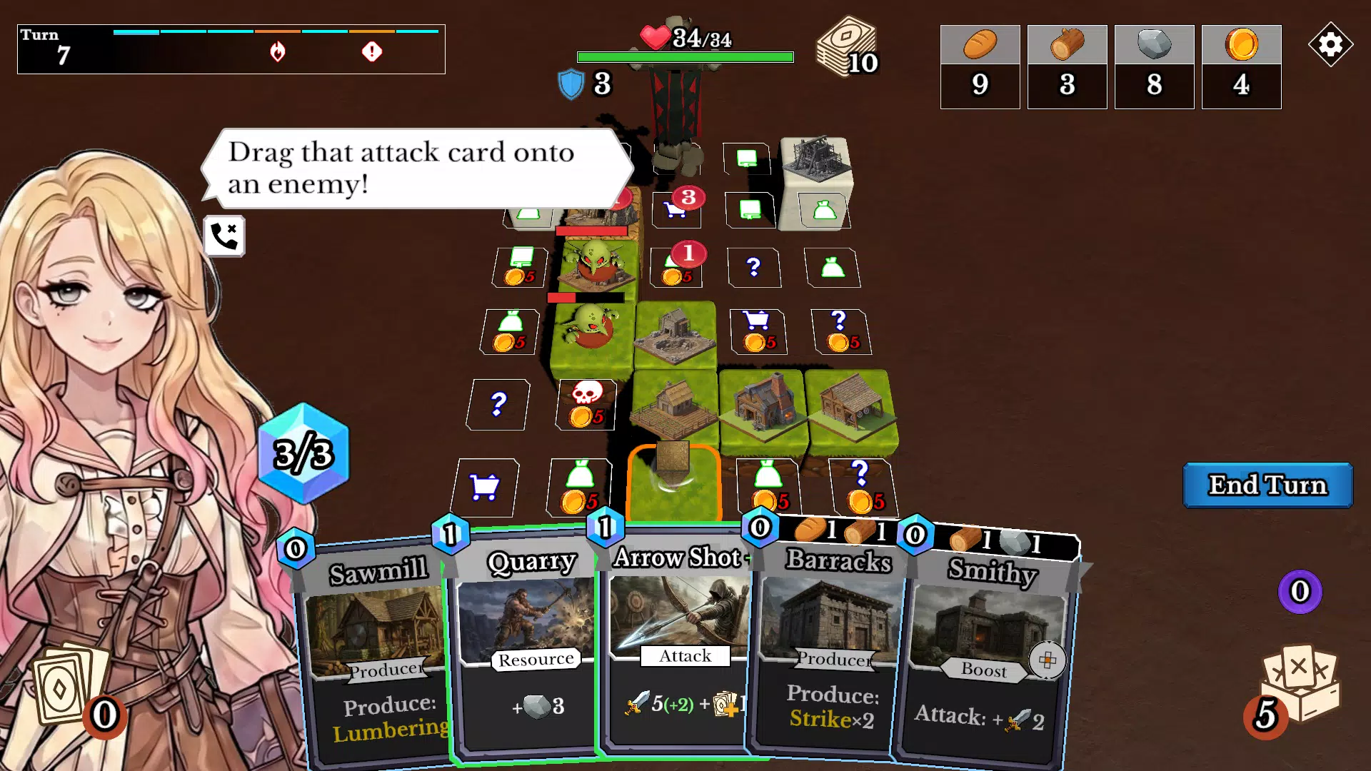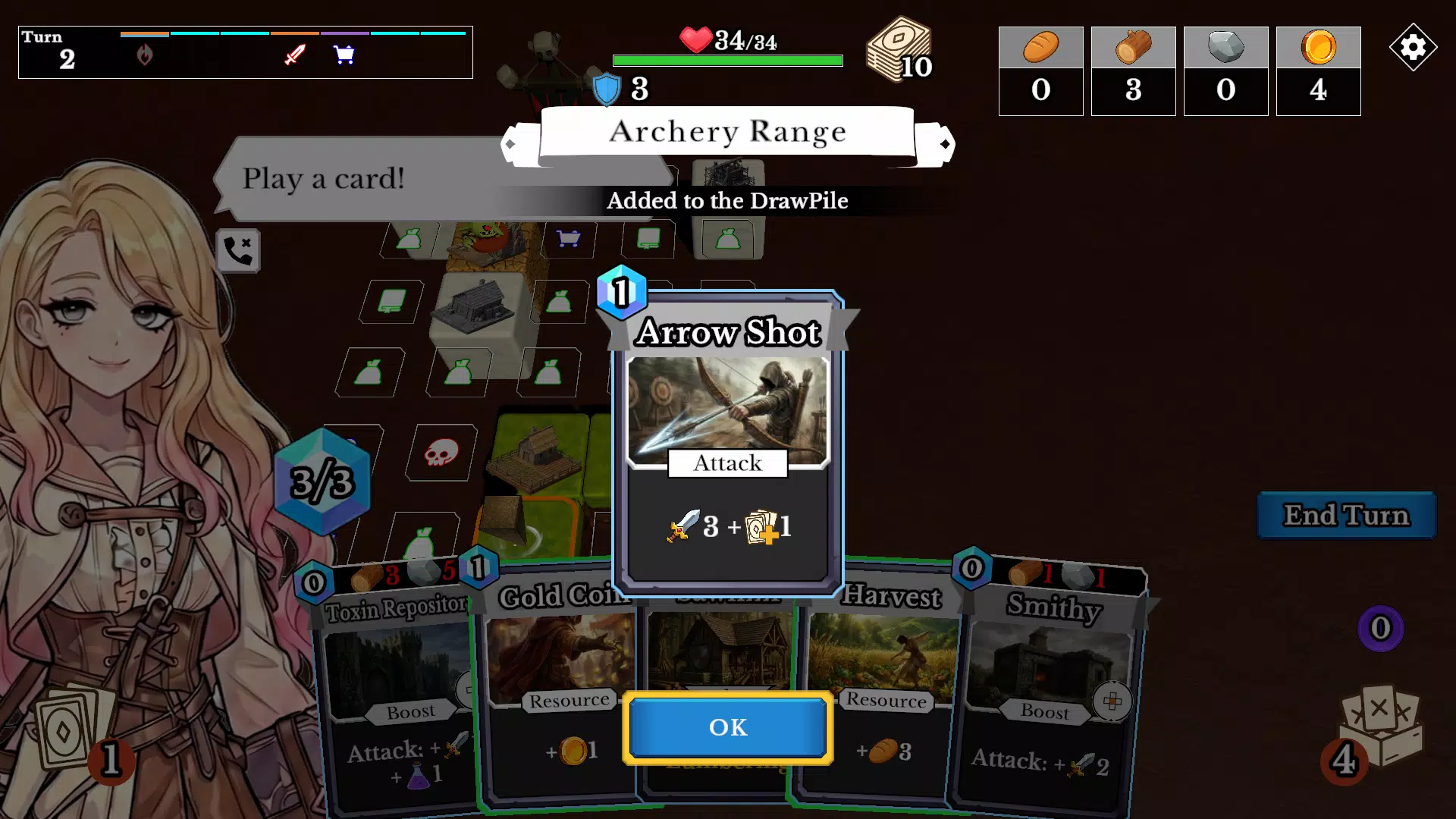 每个回合抽取卡牌,并使用行动卡来收集资源、击败敌人,并强化你的基地。