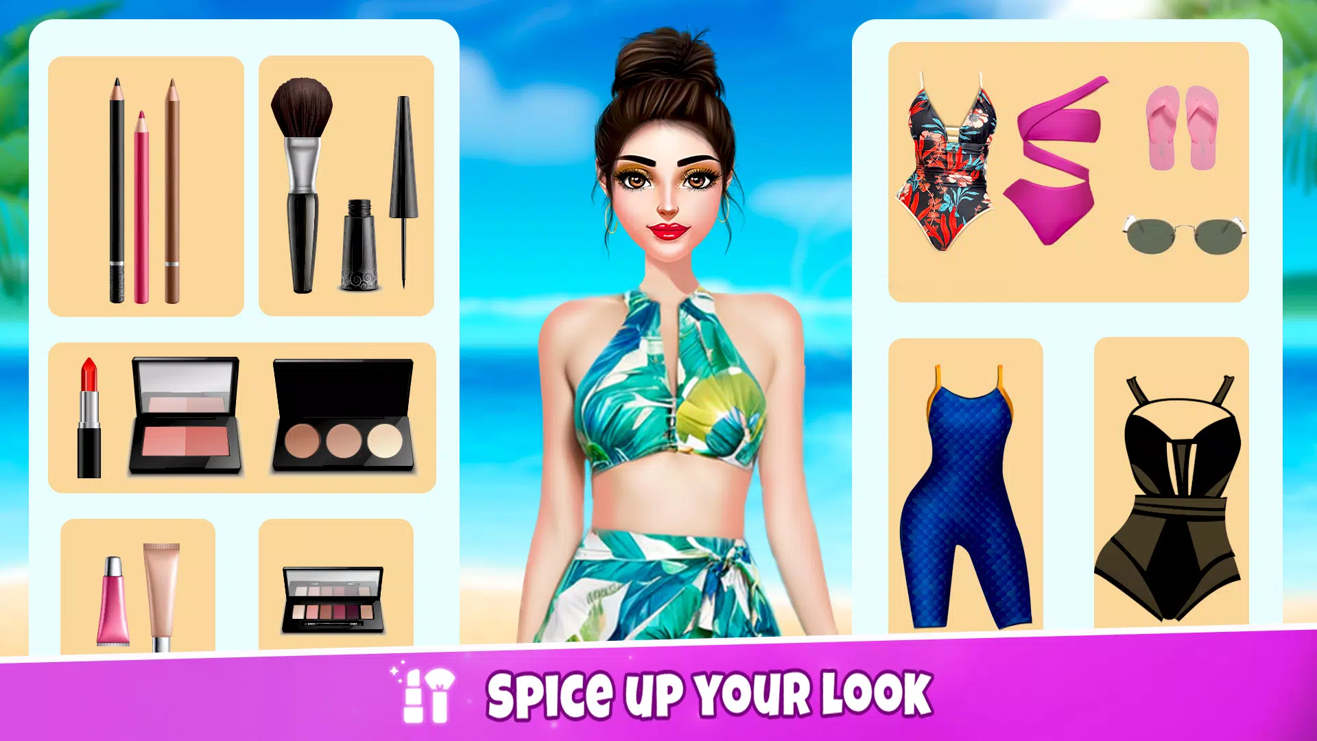 Welcome to the hottest summer beach party of the year! But wait before you hit the dance floor, it’s time to get glam. Select the perfect makeup look to complement beachy vibes with vibrant eyeshadows, sparkling lip glosses, and bronzing powders to create a look. Now it’s time to dress up, choose trendy swimsuits and statement accessories. There’s a look for every beach babe!🍸