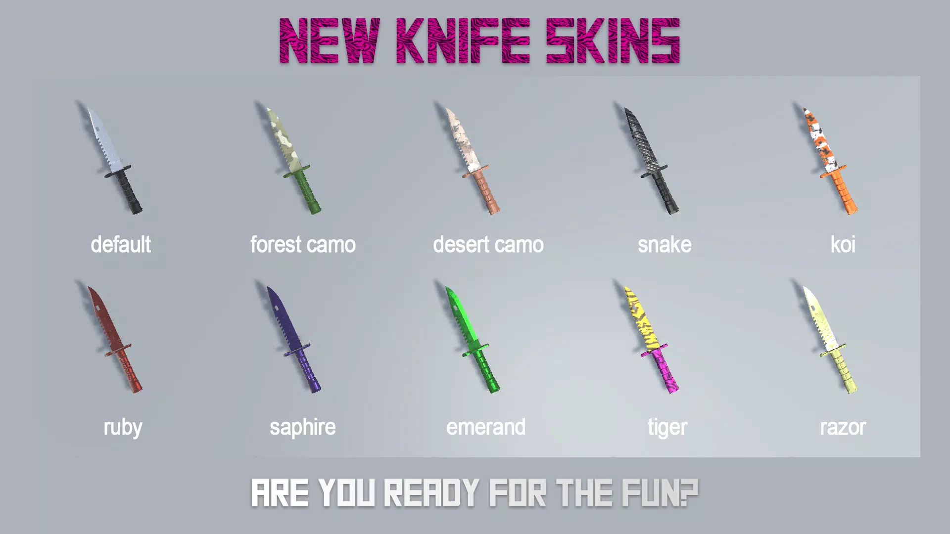 默认、森林迷彩、沙漠迷彩、蛇纹、锦鲤、红宝石、蓝宝石、翡翠、虎纹、剃刀