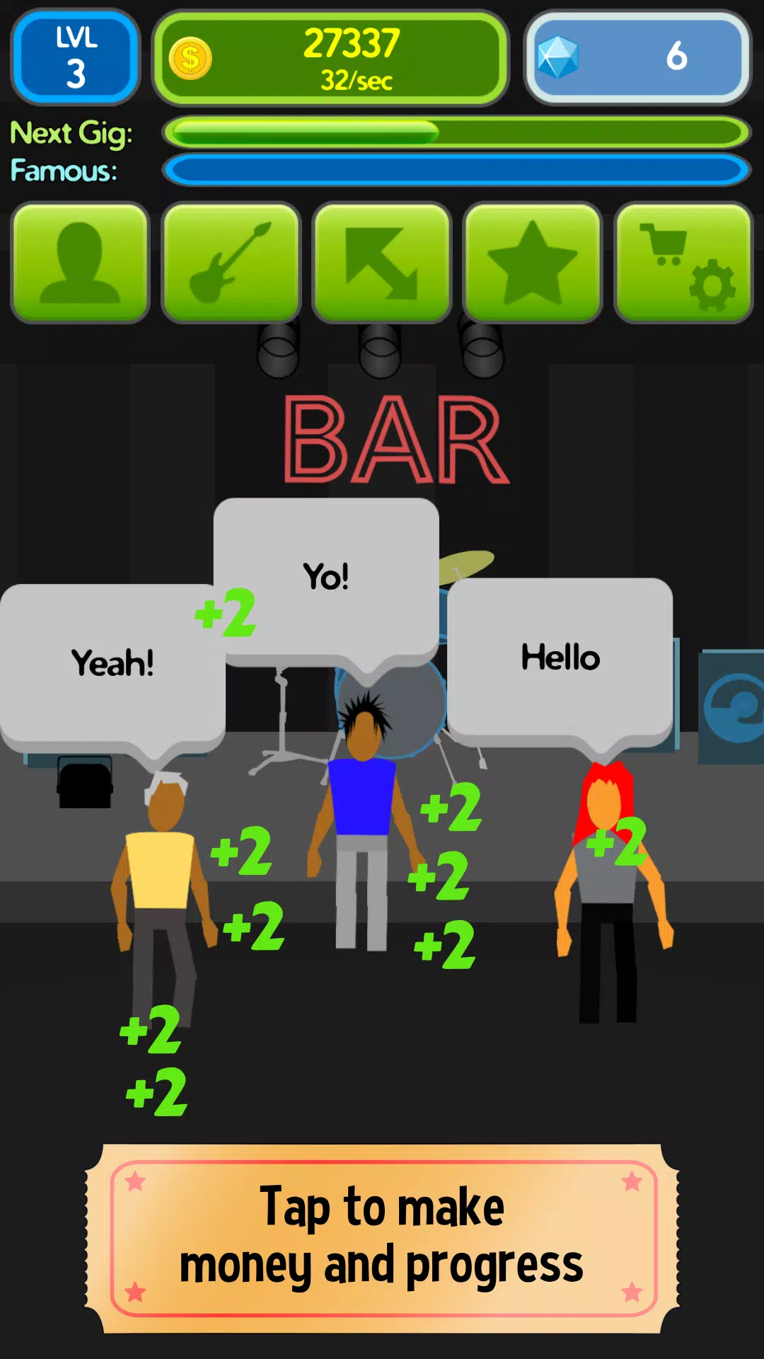 释放你内心的摇滚巨星!通过点击,在这个史诗般的点击冒险中,走向巅峰!通过弹奏史诗曲调和举办令人震撼的演出赚取金钱。雇佣才华横溢的团队,抢购一流设备,并利用能让你的音乐飞翔的强化道具来提高收入。