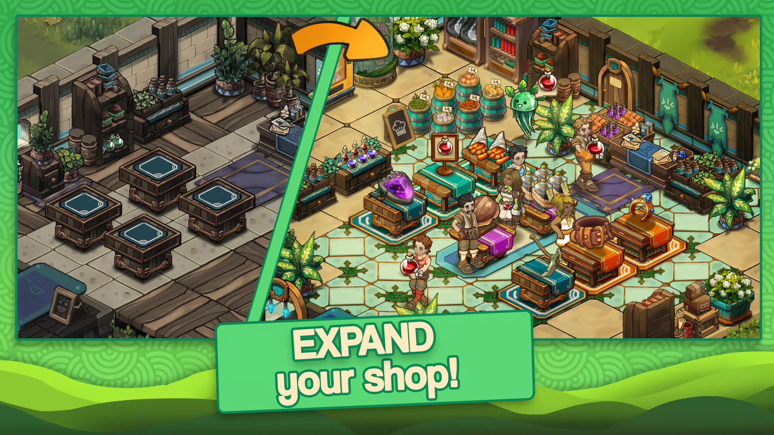 使用数百种可爱的选项、植物、家具、瓷砖和壁纸,构建、设计和定制你的商店布局,让你的顾客和其他店主都感到满意。添加房间、地毯、墙壁和特殊物品,任何可以提升商店品质的东西,让你的商店成为你自己的专属。