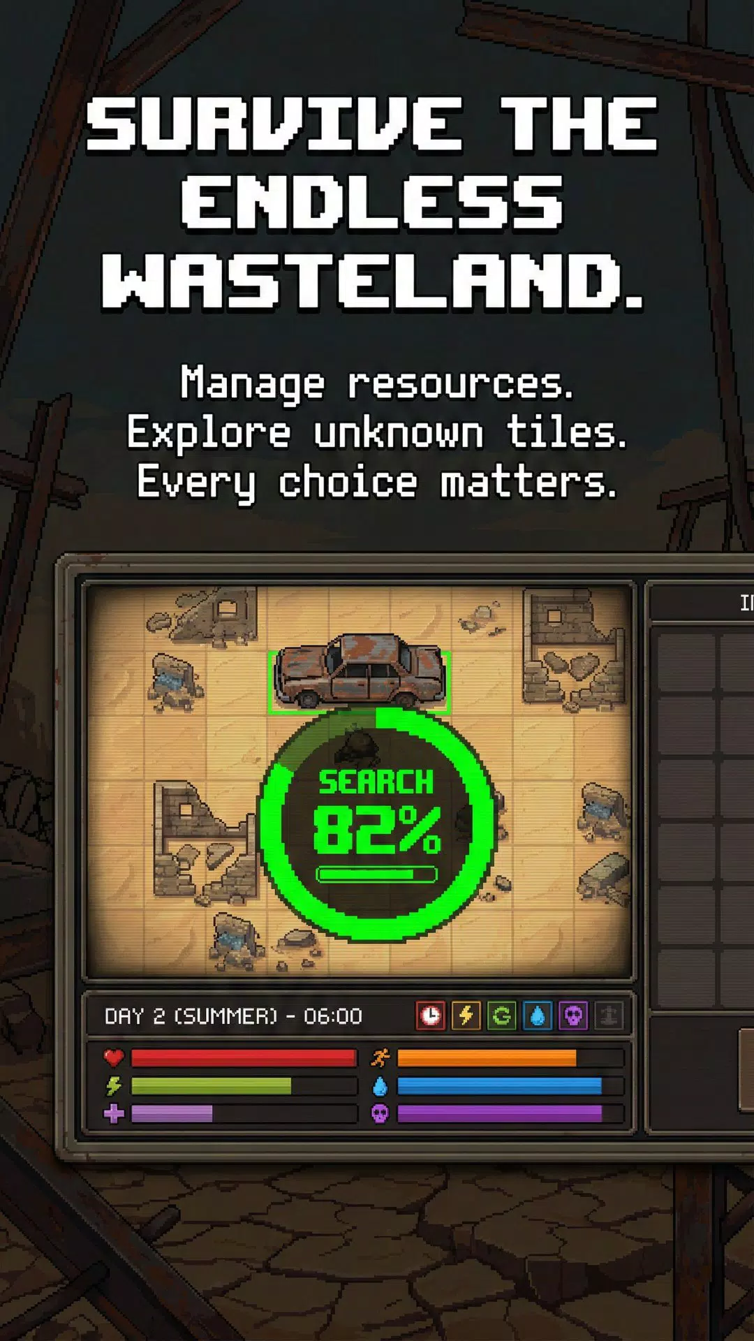 在一张充满废墟、废弃餐馆和致命危险的网格地图上穿行。仔细规划你的路线。你必须权衡探索未知区域的风险与不断消耗的燃料、车辆耐久度和队伍的生存状况。