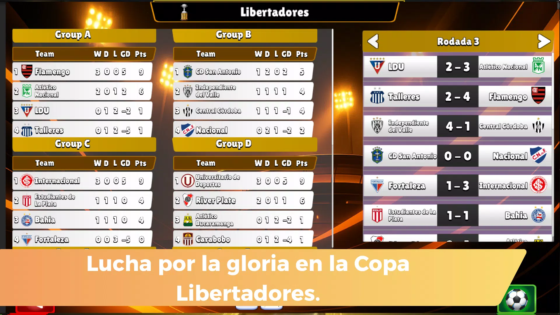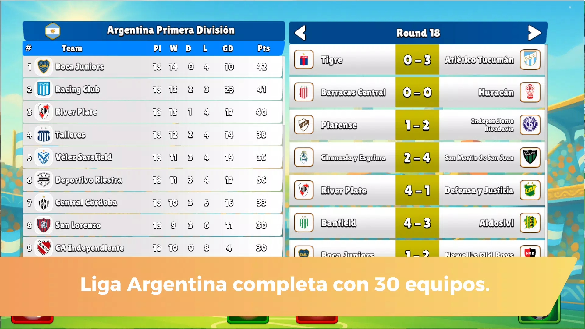 从超过 30 支阿根廷俱乐部中选择你最爱的球队,参加完整的职业联赛赛季,体验精彩刺激的比赛。参与阿根廷杯、南美解放者杯,并争夺世俱杯的参赛资格。