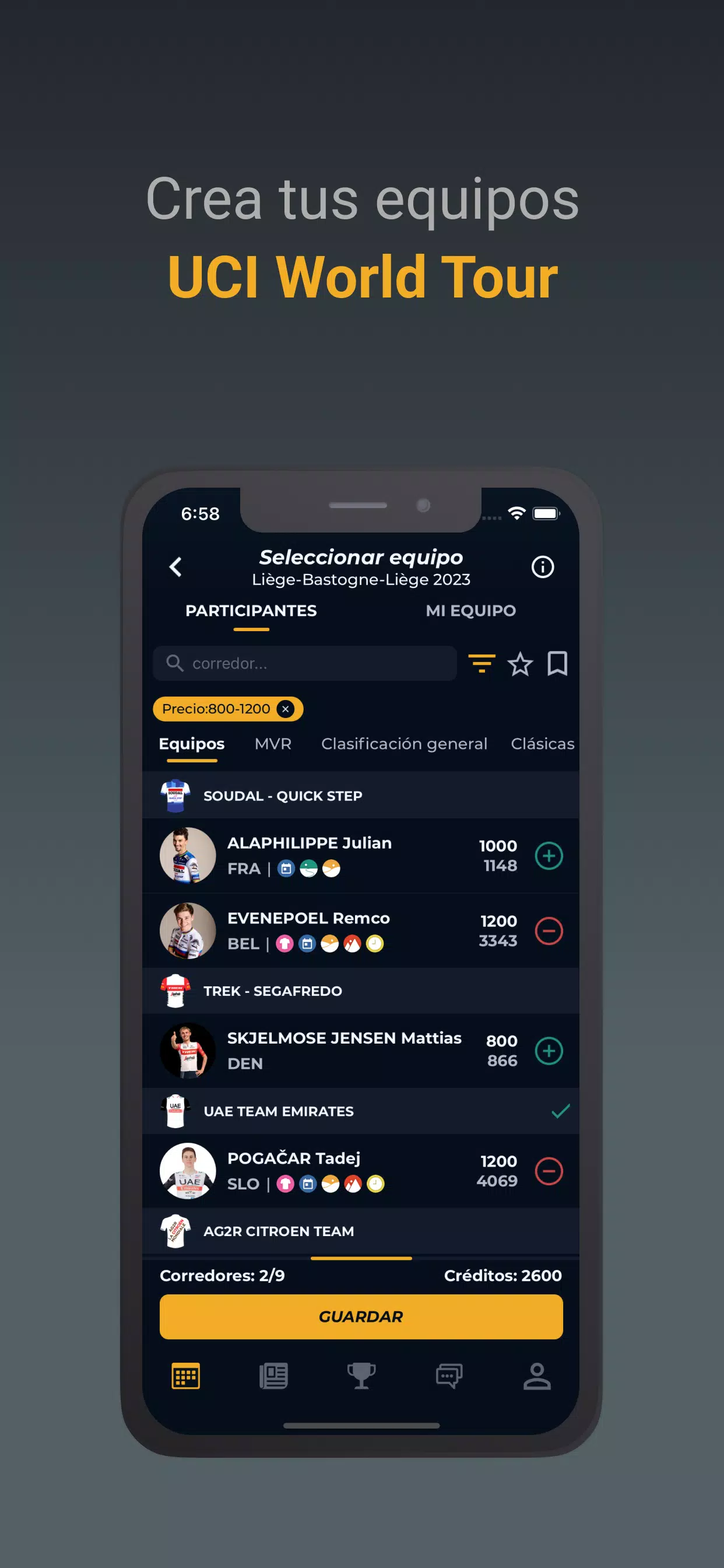 在每场 UCI 世界巡回赛™、.Pro 和越野自行车世界杯比赛前创建您的车队