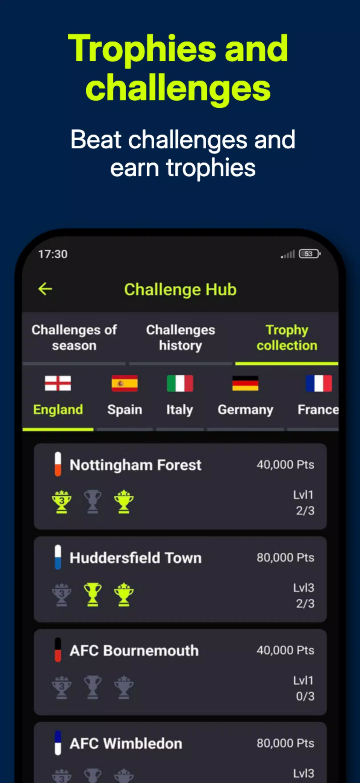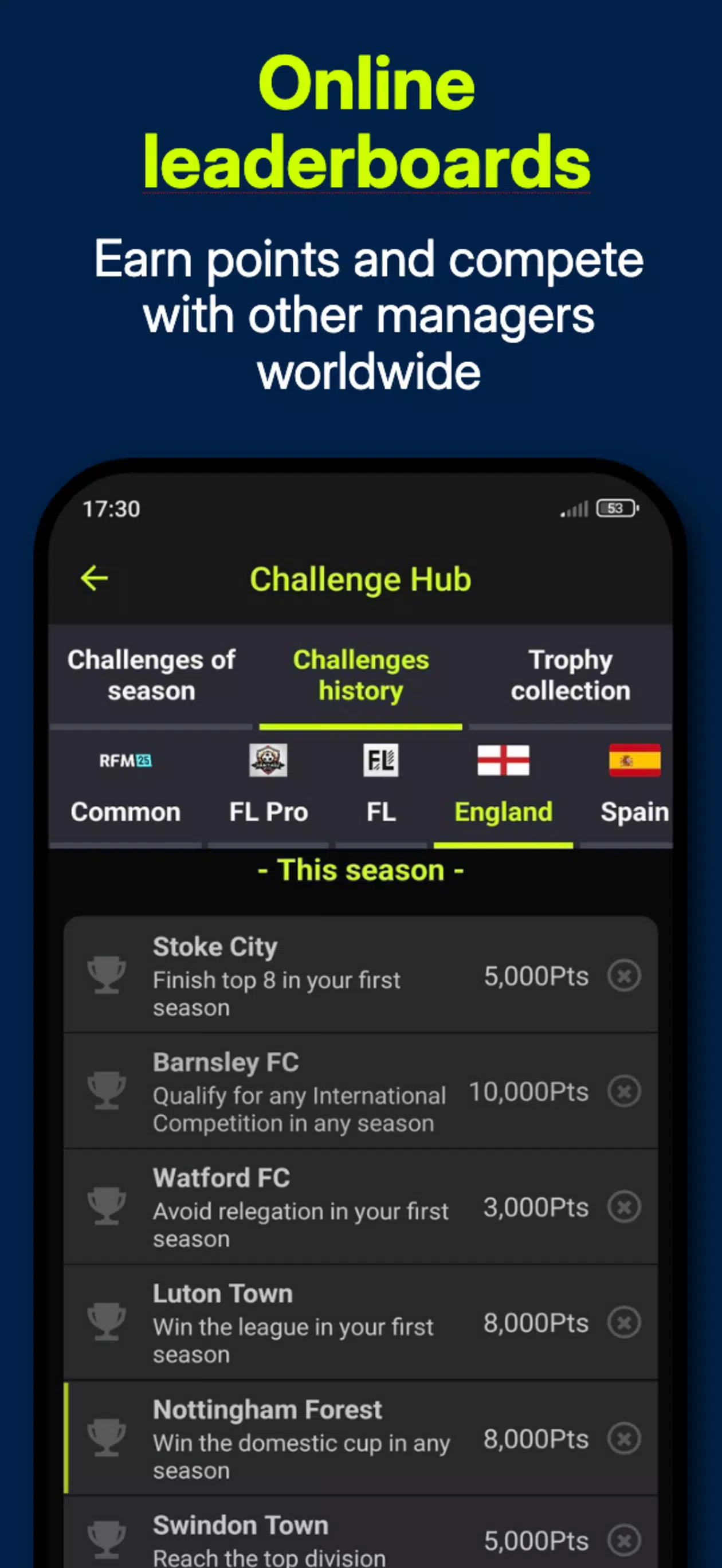 – 足球经理档案:通过赢得奖杯和完成挑战来提升你的声望和能力。随着游戏的进行,免费解锁历史赛季。