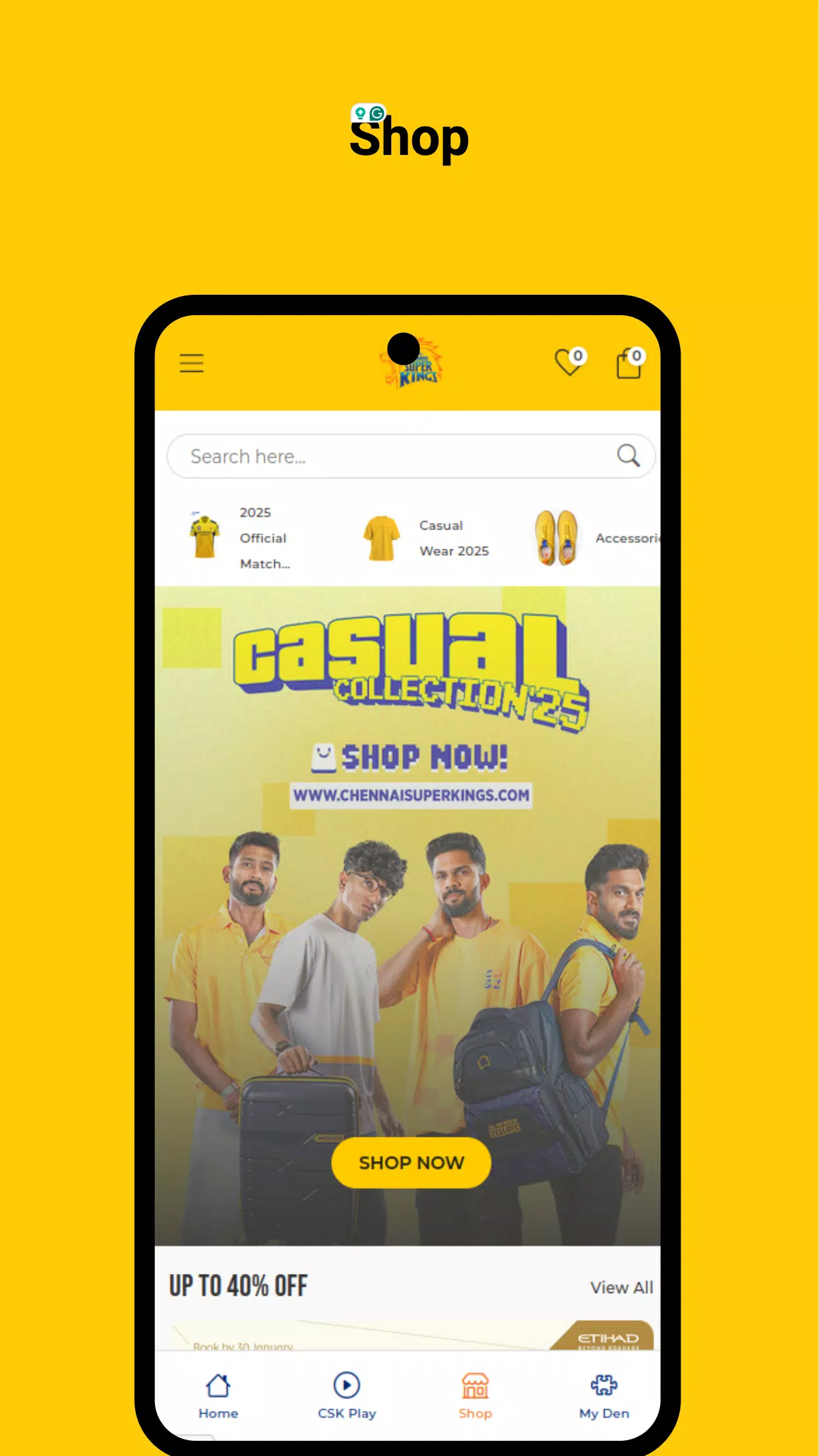 官方周边商店:Paint it Yellow!在钦奈超级商店选购官方球衣和酷炫的钦奈周边商品。
