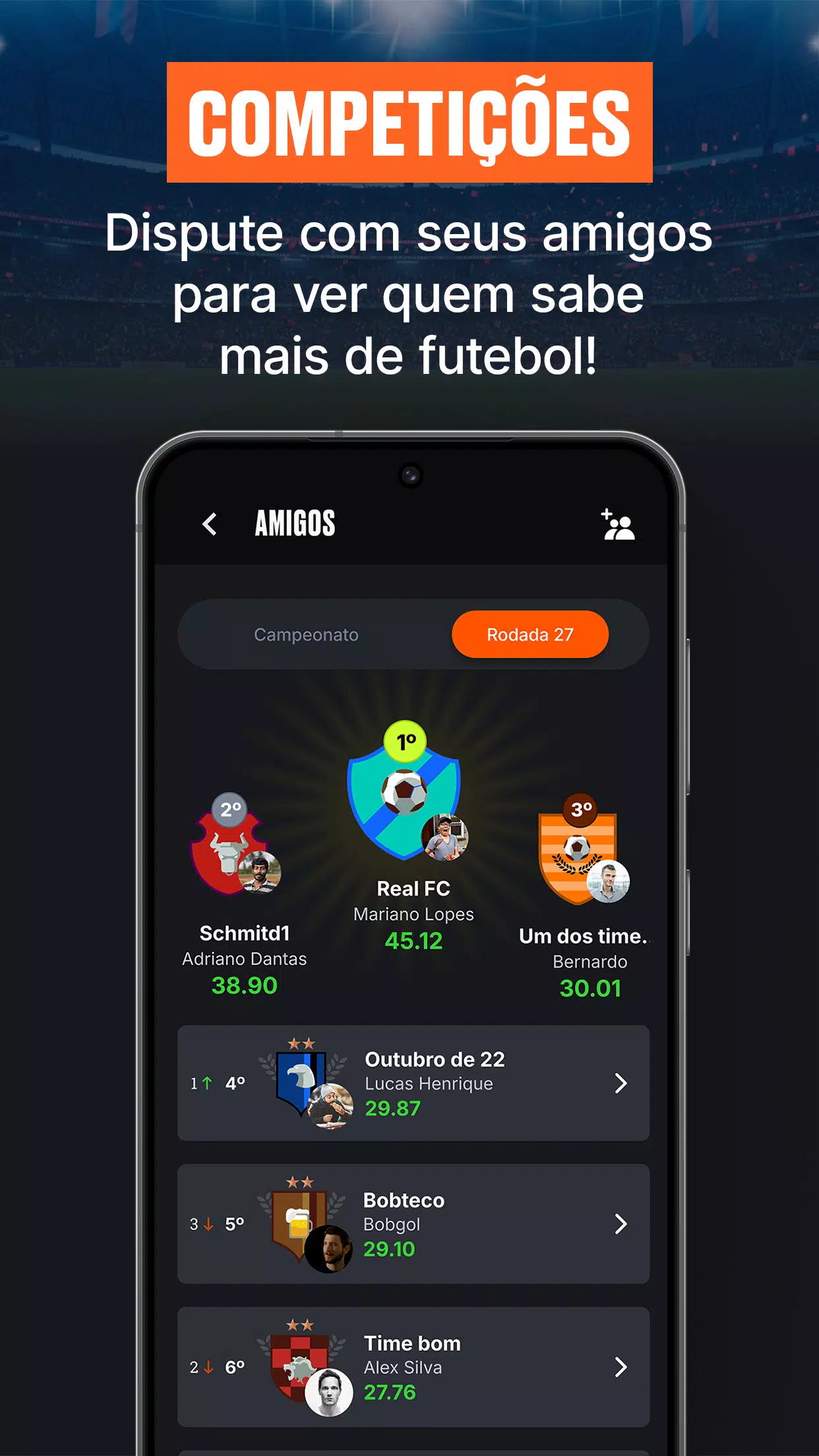 Cartola 不仅仅是一款游戏,更是一种全民热爱的足球运动,它将朋友和家人凝聚在一起。有了 Cartola,巴西甲级联赛、欧冠联赛以及更多精彩赛事尽在您的掌握之中!立即下载,开始组建您的巴西联赛球队。关注比分,随时掌握足球世界的最新动态。加入我们这个充满激情、热爱足球和巴西联赛的社区吧!
