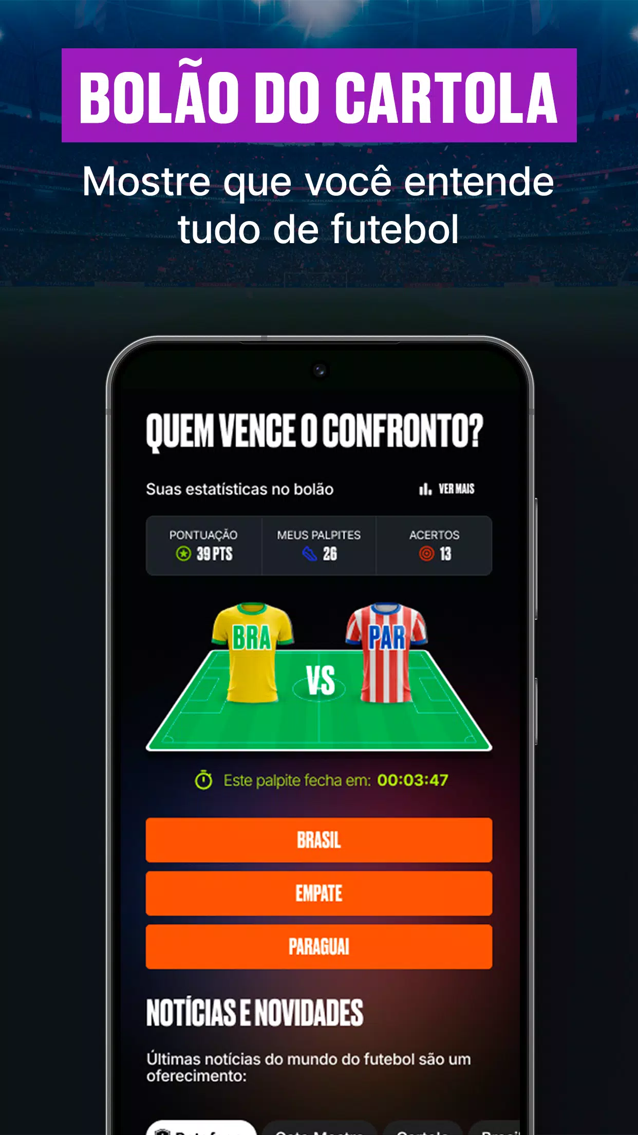Cartola 竞猜:预测比赛结果,并与好友一起创建巴西甲级联赛、乙级联赛以及赛季中其他众多锦标赛的竞猜池。