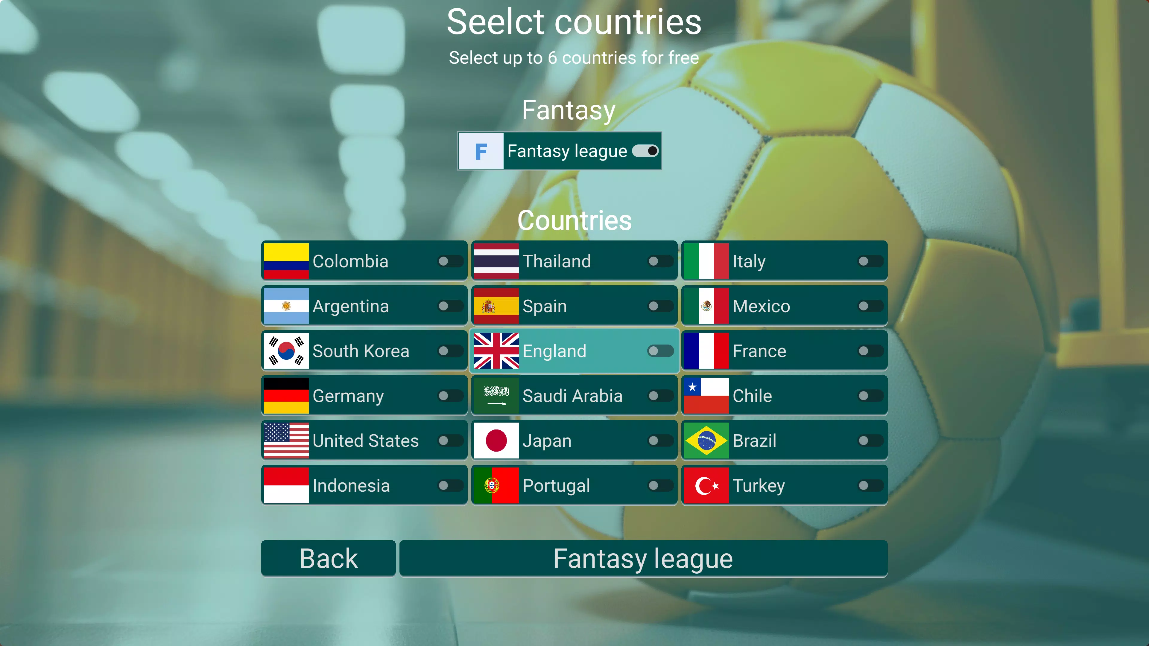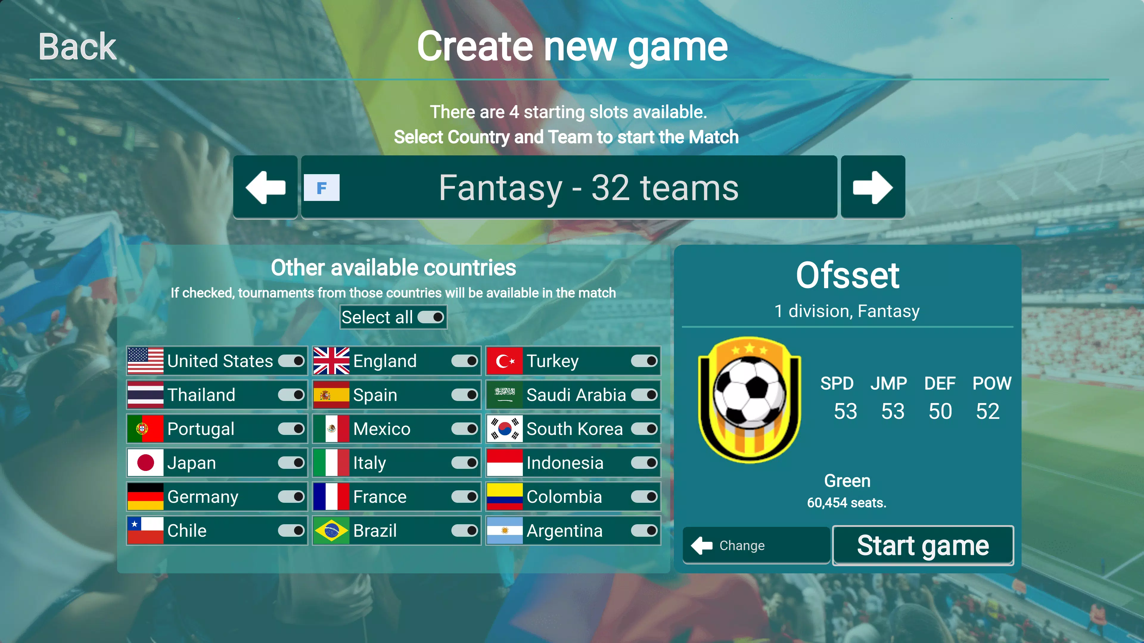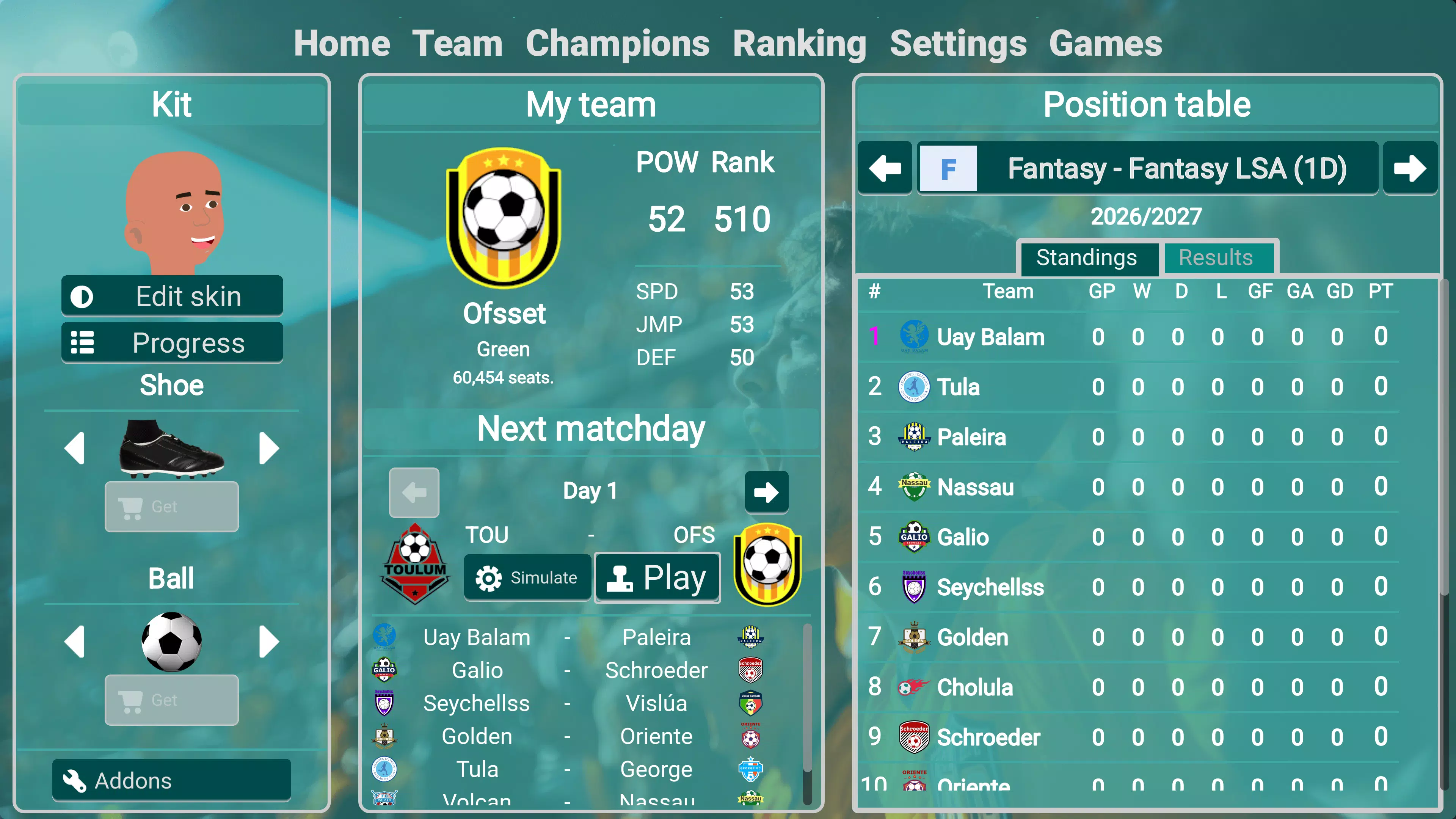 一款 2D 无限足球锦标赛模拟游戏。你可以选择球队、自定义球员、参与比赛,并争夺冠军。