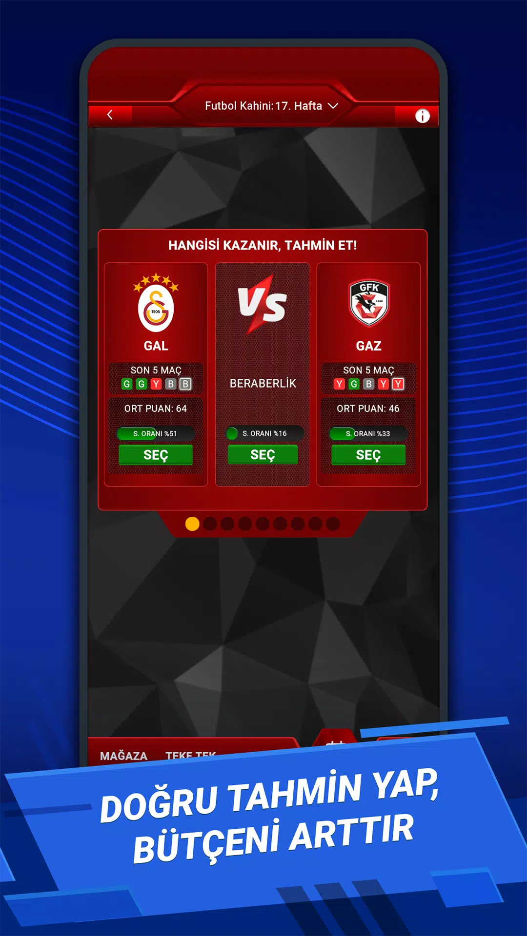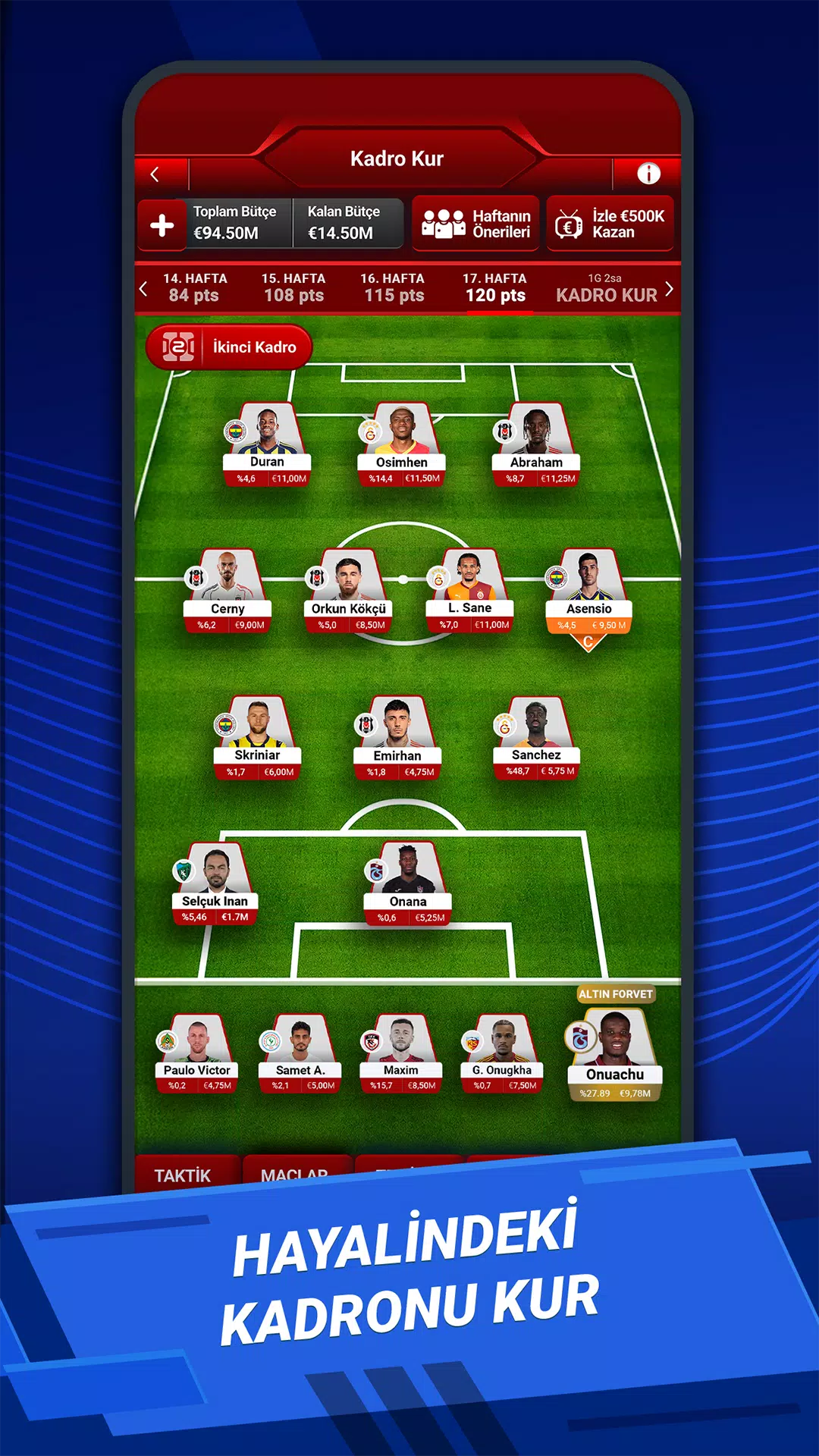 加拉塔萨雷的伊卡尔迪或奥斯梅恩进球,您将获得积分。费内巴切的约翰·杜兰或弗雷德助攻,您还可以获得额外积分。贝西克塔斯门将梅尔特·古诺克零封对手,您将获得额外积分。特拉布宗体育的维斯卡在场上表现出色,您的积分就会增加。每周、每场比赛、每个实时比分和每个结果都可能改变您的比赛进程。