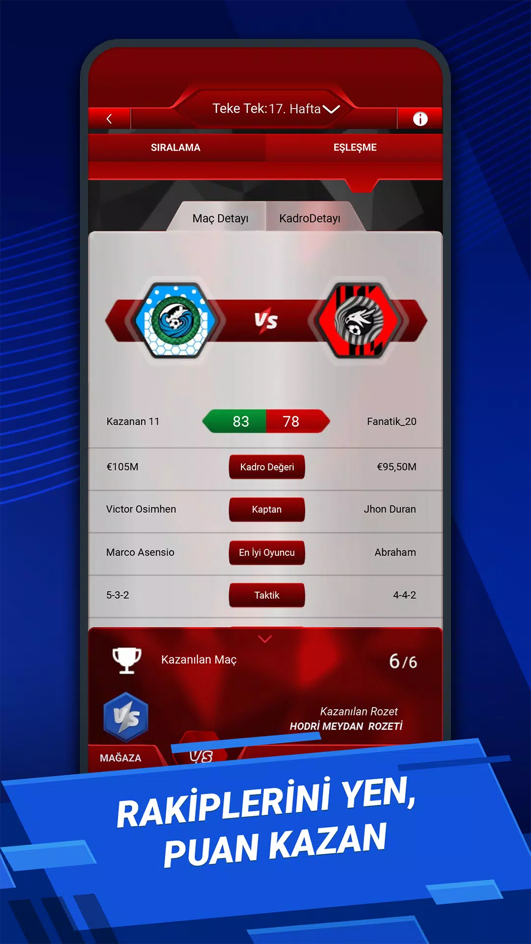 每周,您都需要组建新的阵容。您需要进行转会。加拉塔萨雷在赛程、费内巴切、特拉布宗体育的防守还是贝西克塔斯方面更有优势?您需要考虑这些因素,进行分析,然后组建最佳阵容。社交联盟 (Social League) 并非预测游戏;而是一款实时竞技的梦幻足球游戏,您可以通过分析实时比分、比赛结果、球员统计数据,并在正确的时间做出正确的转会决策来赢得胜利。