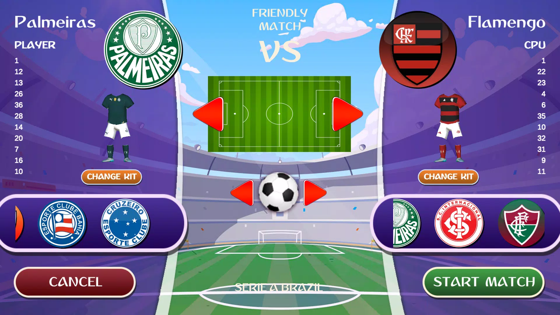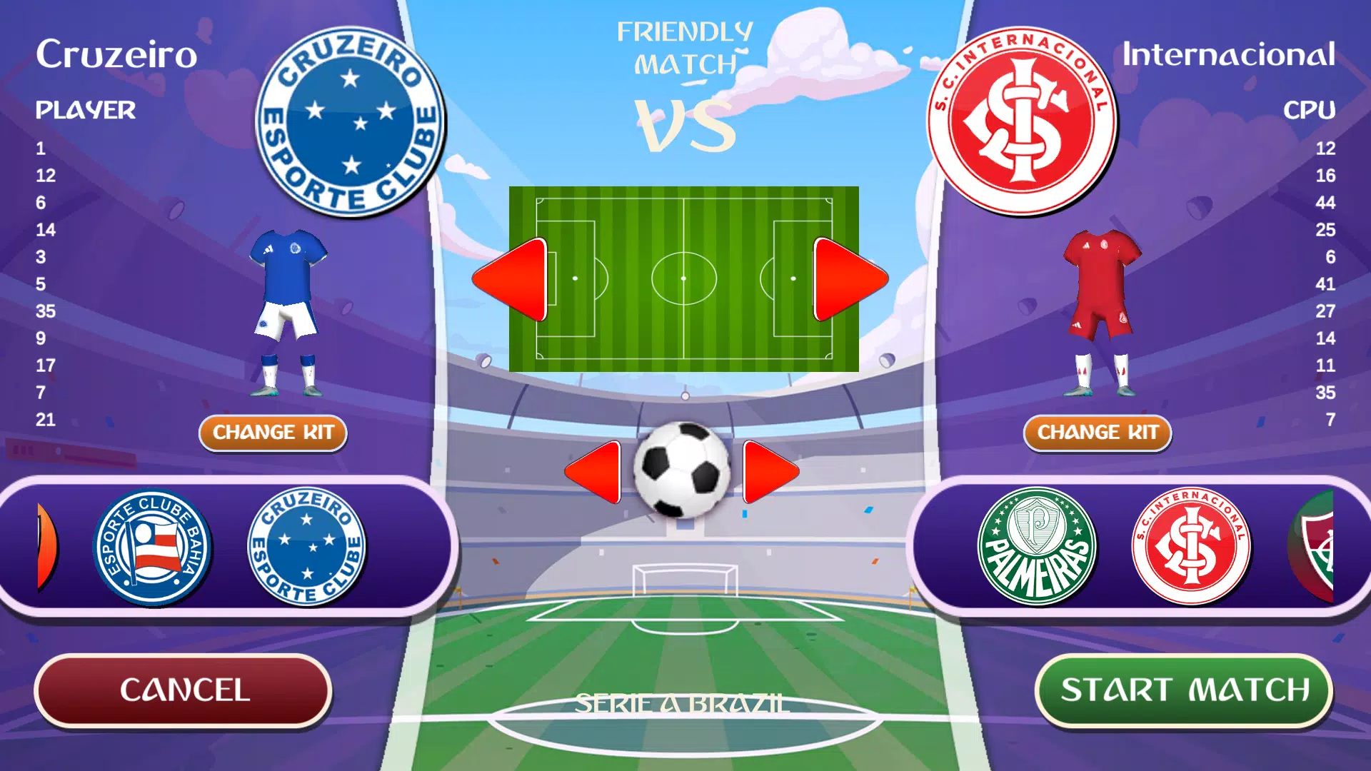 巴西超级联赛比赛提供了在单人模式中挑战自我并尝试击败对手并赢得巴西甲级联赛冠军头衔的机会。您还可以与巴西足球最强的球队进行一场友谊赛。