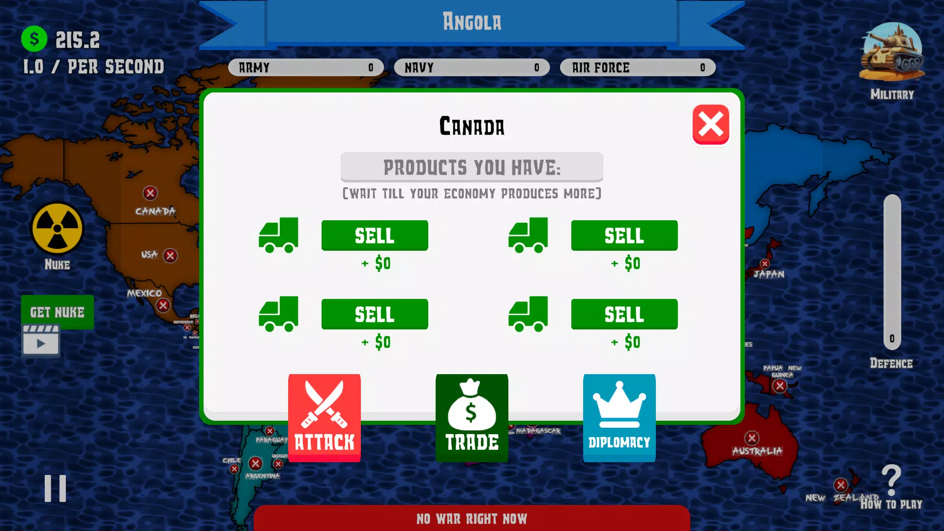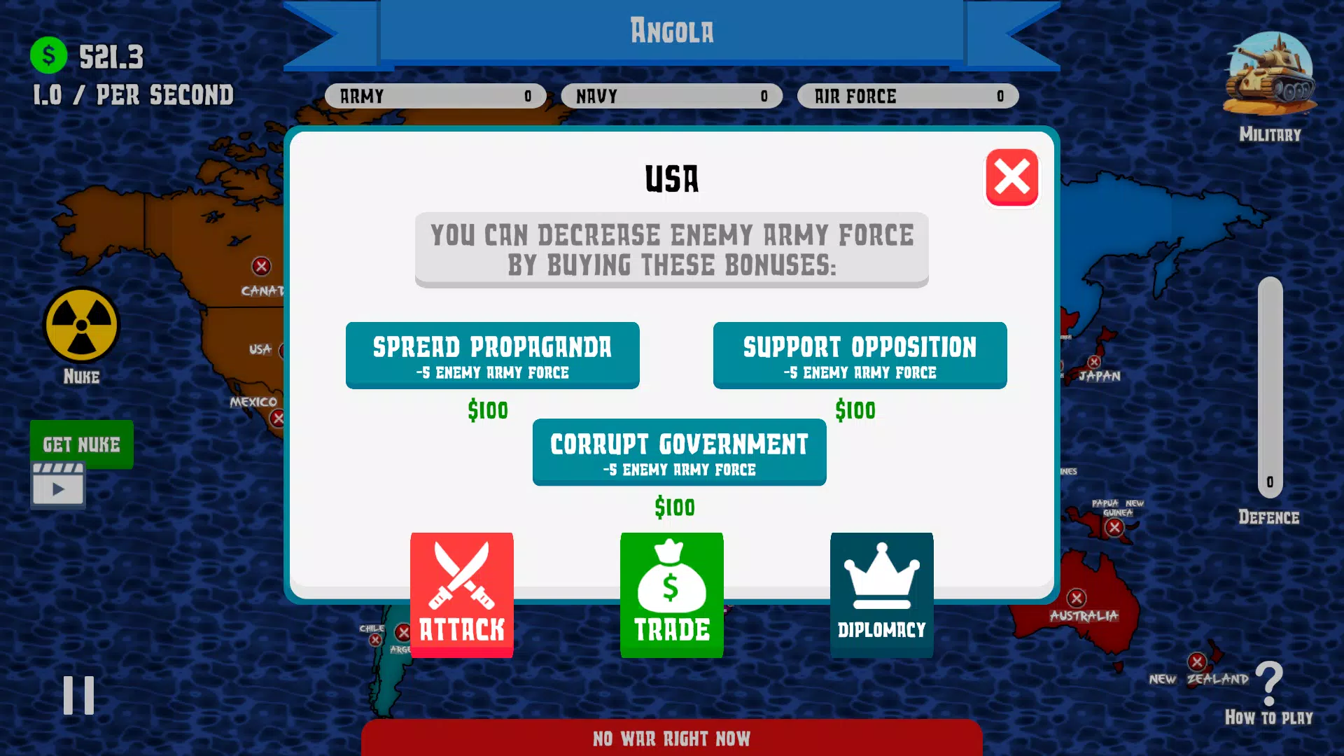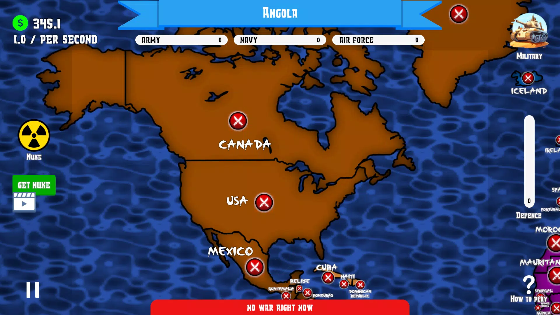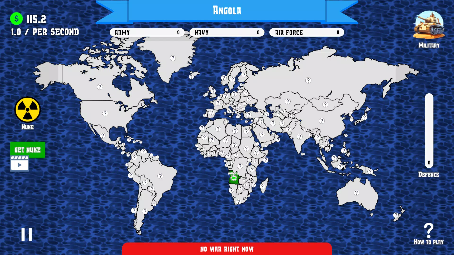 星球被划分为5个不同的区域,你的目标是征服各国,利用他们的生产力为你的军队服务,并利用这些生产力征服更多领土!你唯一的方法是通过三种不同的方式升级你的军队:陆军、海军和空军。💥💥