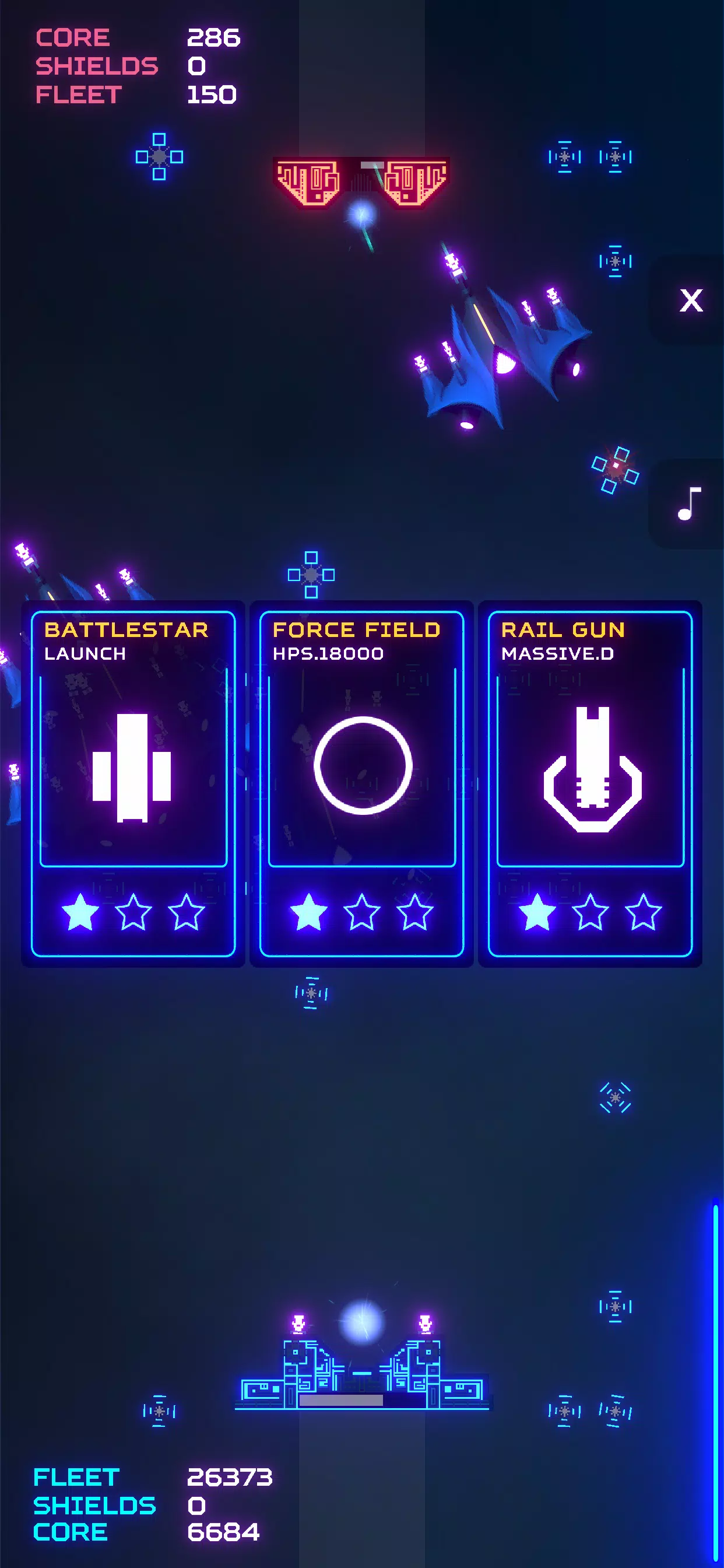 🛰️ 你的征程始于一个基地、几个前哨站和一支小型舰队。每 20 秒,从随机抽取的 3 张卡牌中选择 1 张,部署舰船、发动攻击或激活足以改变战局的效果。