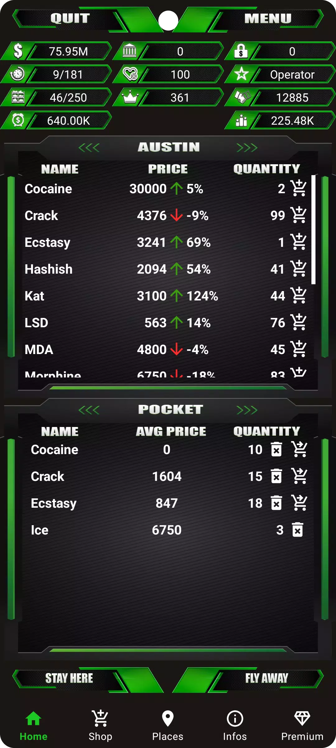 欢迎来到高风险的毒品交易世界!在游戏中,你将扮演一个口袋里只有几千美元的毒贩。你的目标是在短短50天内,通过买卖毒品,将这笔小额投资转化为尽可能多的财富。提升等级或购买生意,可以提升你的交易天数。不过要注意,毒贩的生活充满风险;似乎每个人都想用各种方式伤害你——警察、街头帮派、高利贷者,甚至你的客户。