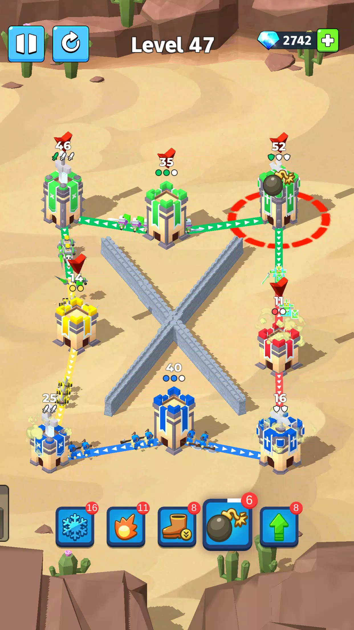滑动手指即可连接塔防。你需要带领蓝色士兵守卫自己的塔防,同时占领其他颜色的塔防。