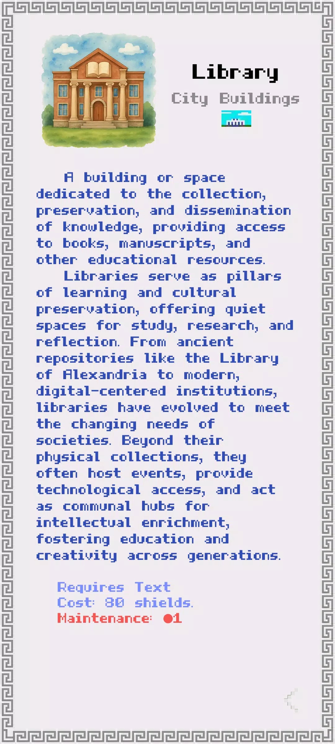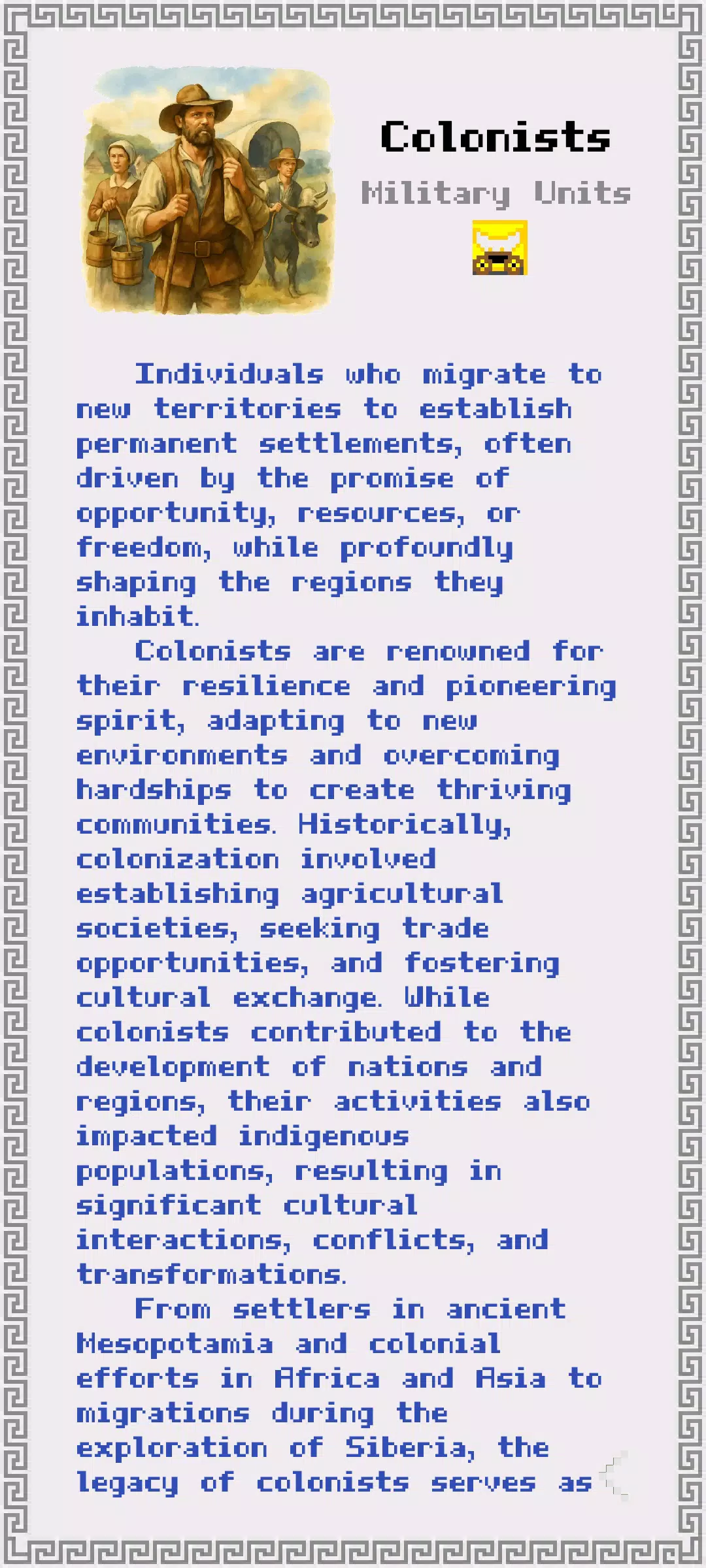 在 Pedia 中了解更多关于游戏概念、文明进步、奇观和科技、政府形式、军事单位及其行动、地形类型和改良、城市建筑和灾害的信息。