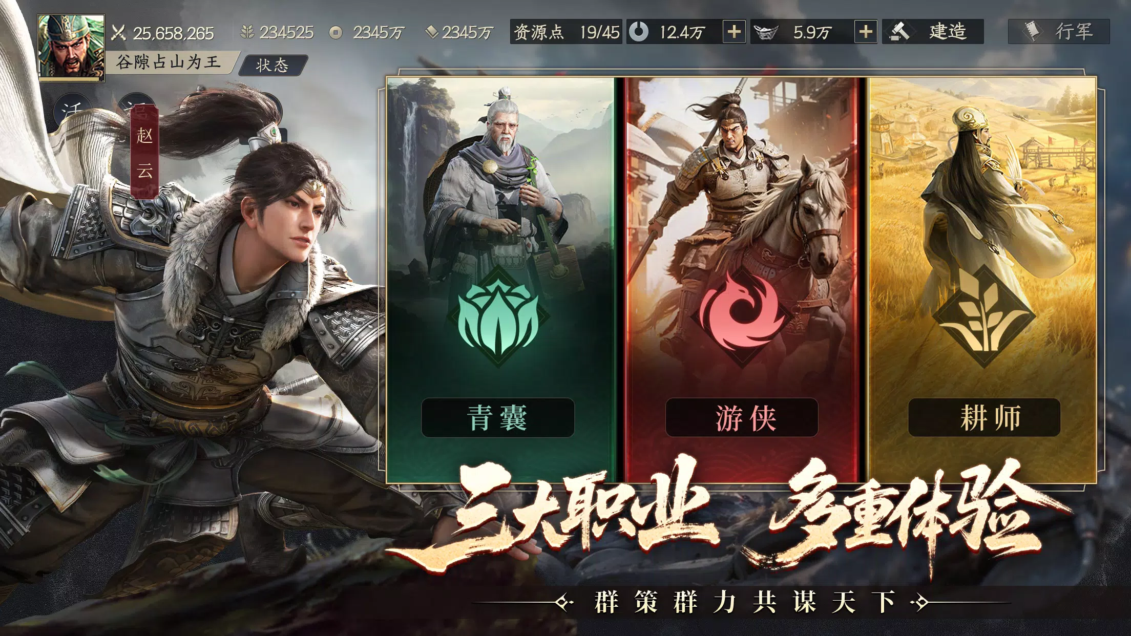 身处三国乱世,你可以扮演征战沙场的游侠、悬壶济世的青囊、屯田发育的耕师。三大职业互相配合是战场中获胜的关键,不同的职业技能可以极大影响战术及局势,你可以和盟友一起各司其职,利用一个个精彩的职业策略组合,群策群力谋定天下,体验完全不一样的SLG游戏乐趣,书写属于你的三国故事。