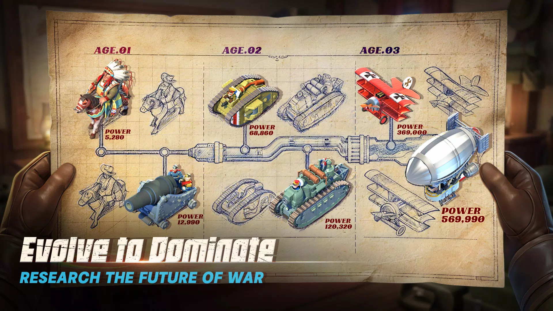 化身 20 世纪最伟大的军事家。招募并指挥以历史为原型的人物,每位人物都拥有独特的技能和战术加成。无论是“铁血宰相”还是“沙漠之狐”,这些将军都将带领你的军队走向辉煌。组建一支跨越不同时代的梦幻将军队伍! ▶ 建立并发展你的帝国
