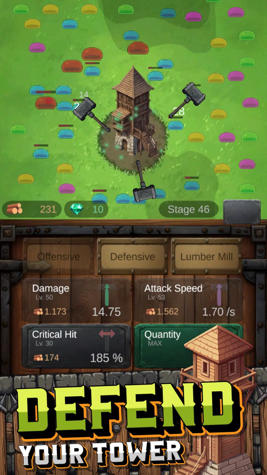 进攻:通过升级伤害、攻击速度、暴击伤害和锤子数量来增强塔的主要武器。在史莱姆大军抵达你的城墙之前将其摧毁!