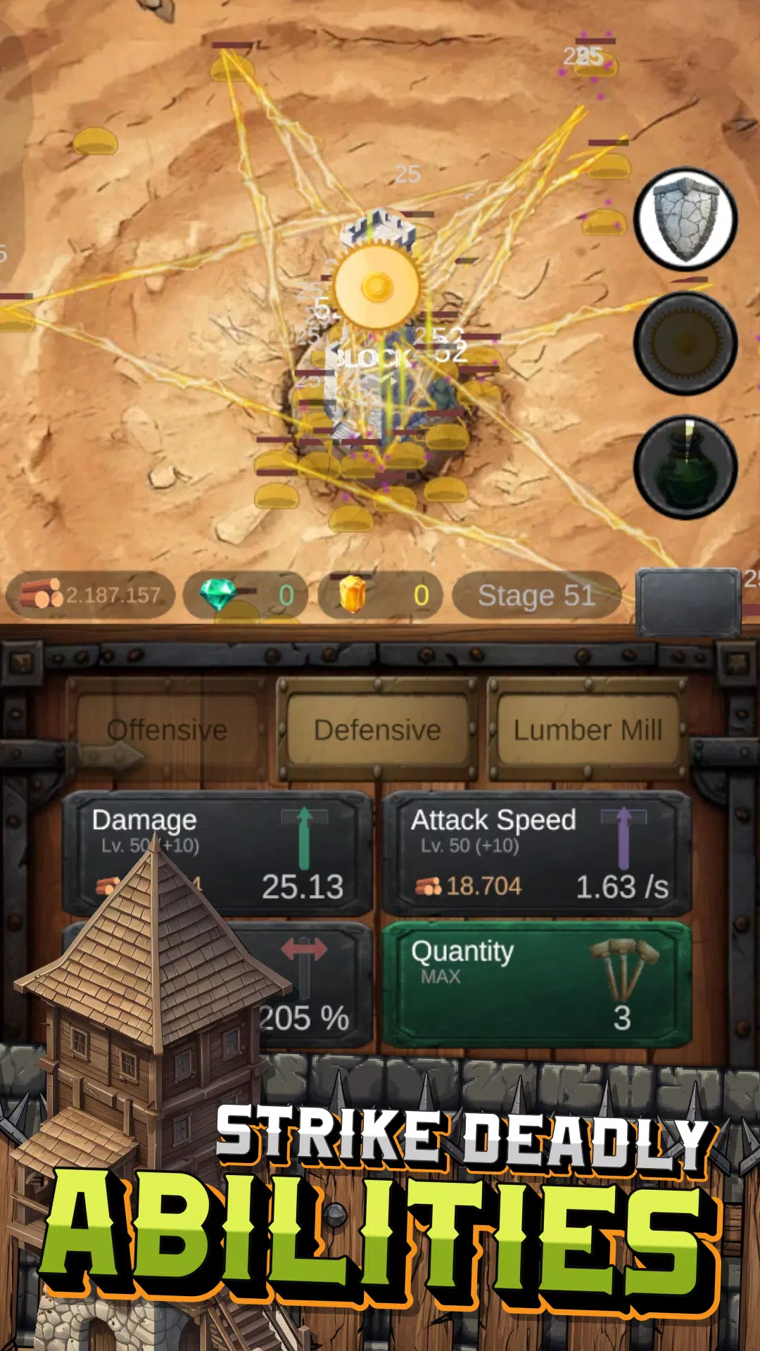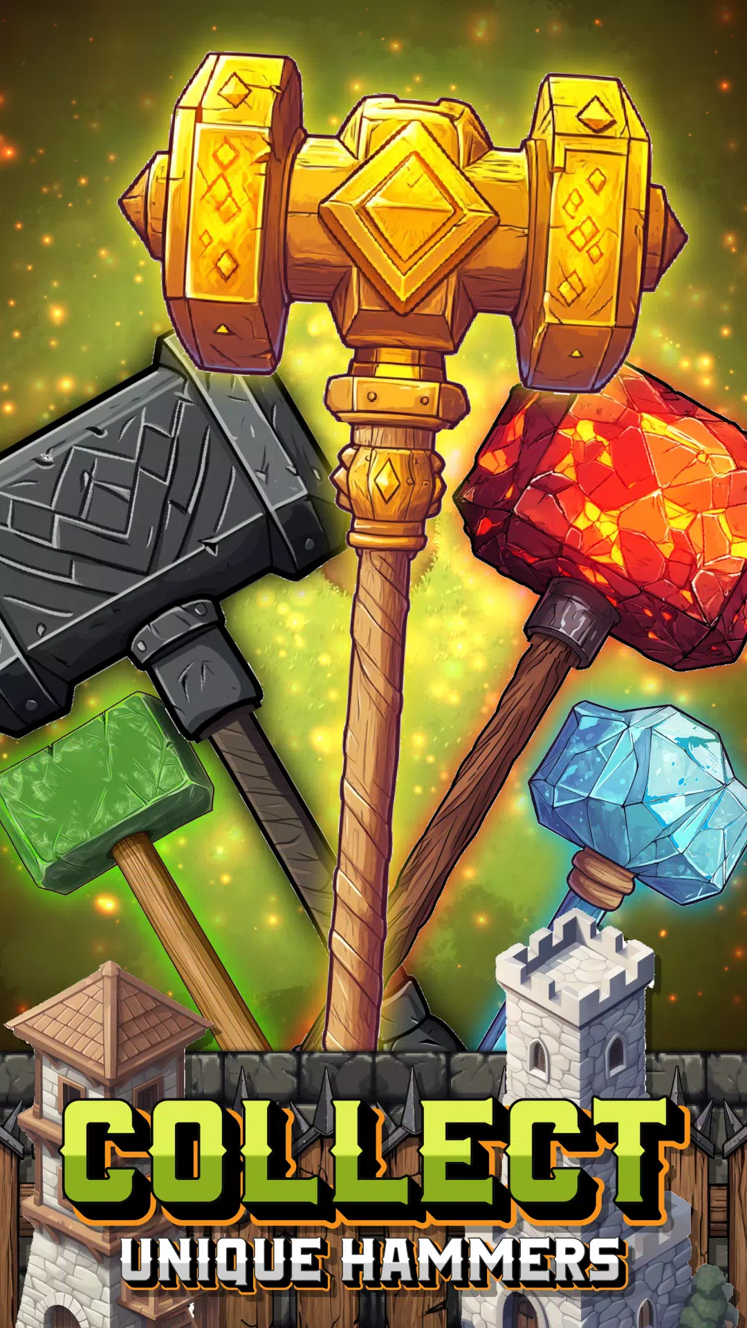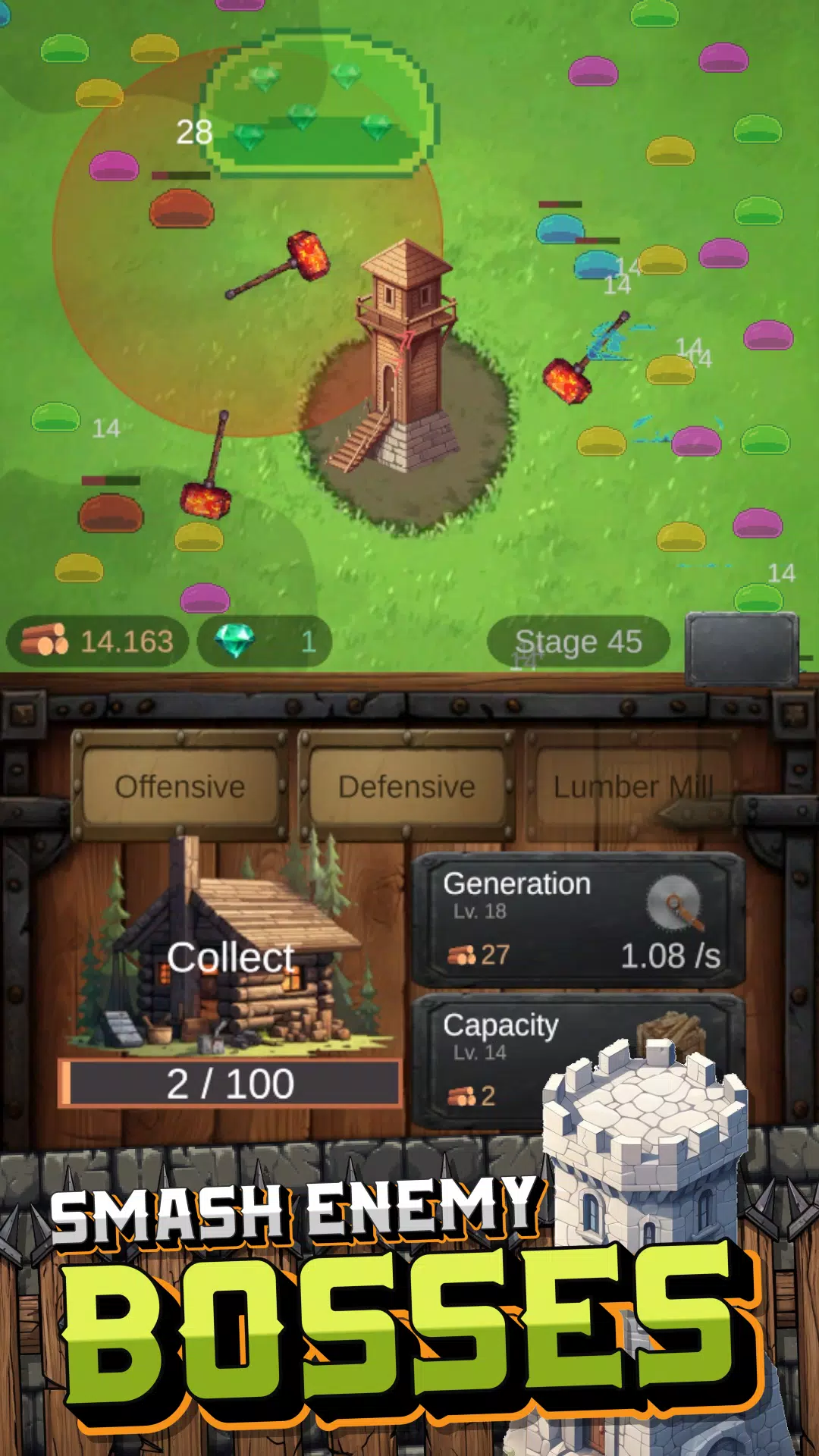 战斗将持续数个激烈的回合,直到你的塔楼倒塌。你必须使用自动锤子摧毁史莱姆并收集木材。这些木材是你的生命线,让你能够快速购买强大的临时升级,以在猛烈的攻击中保持领先。