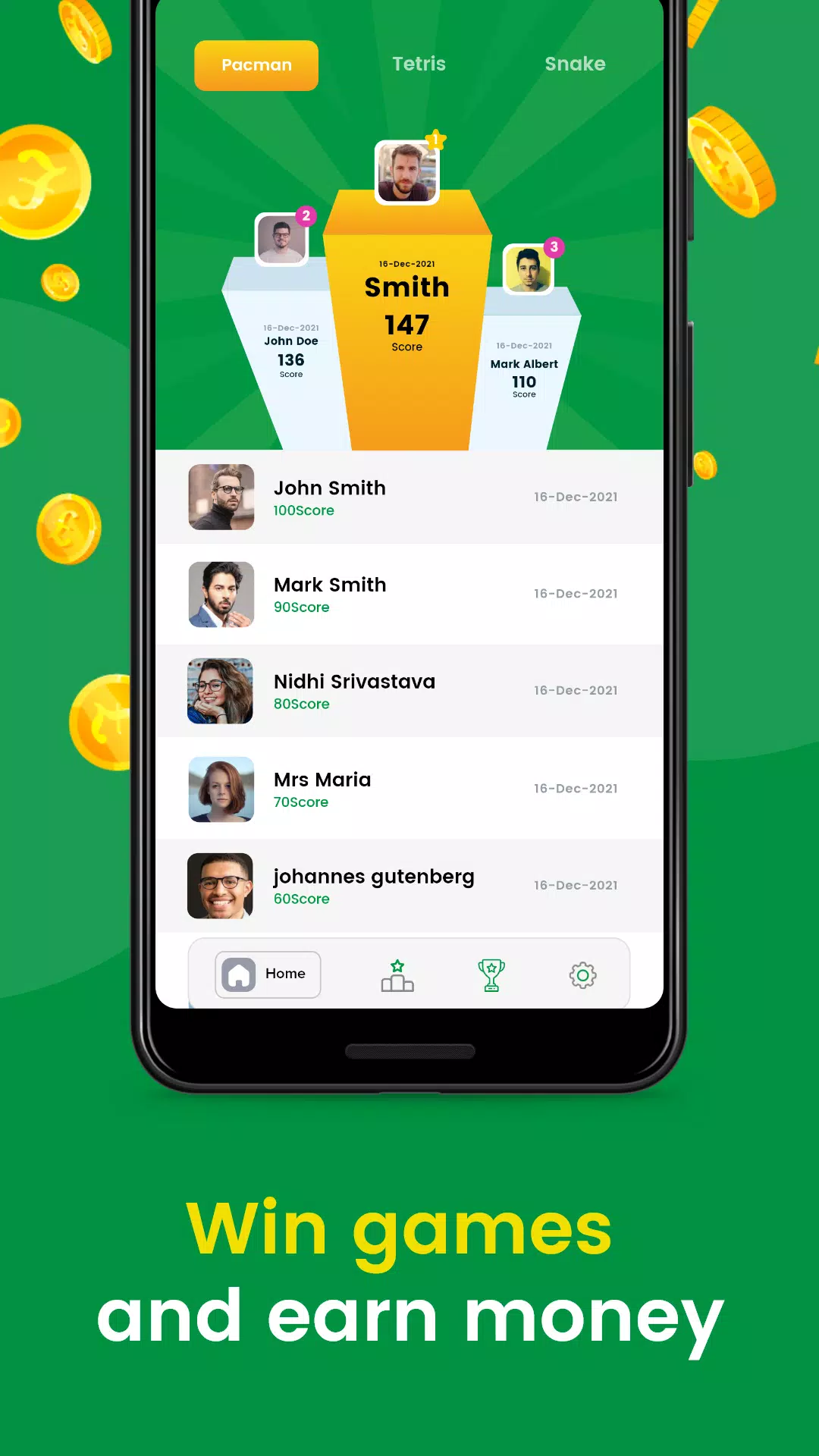 用户可以在应用程序的赢家界面查看每款游戏的前 10 名赢家,还可以查看自己每款游戏的积分榜以及日期和时间。这款赚钱应用还允许赢家选择将奖金兑换成数字货币或真实货币。他们可以使用数字货币兑换成金币来玩更多游戏,或者用户也可以选择通过连接银行账户,直接从应用平台领取真实货币作为奖金。