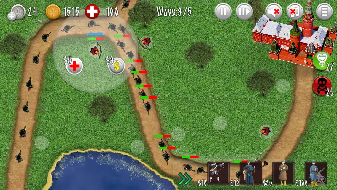 敌人不会像地图上那样随意移动。他们也会造成伤害,甚至可以击杀防守方。你可以在当前关卡内治疗你的战士、更换防御塔或升级它们。
