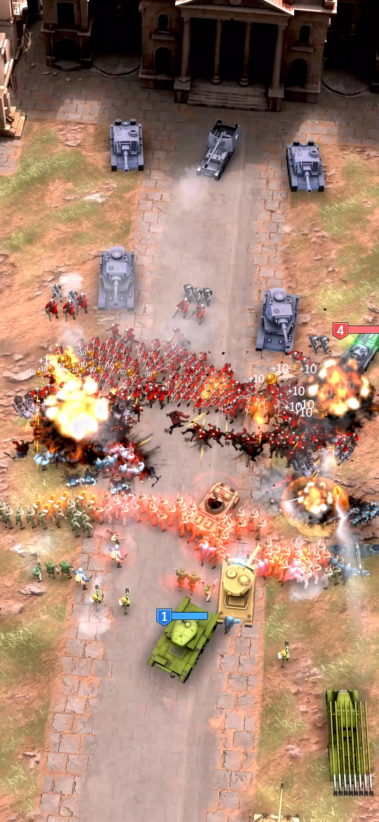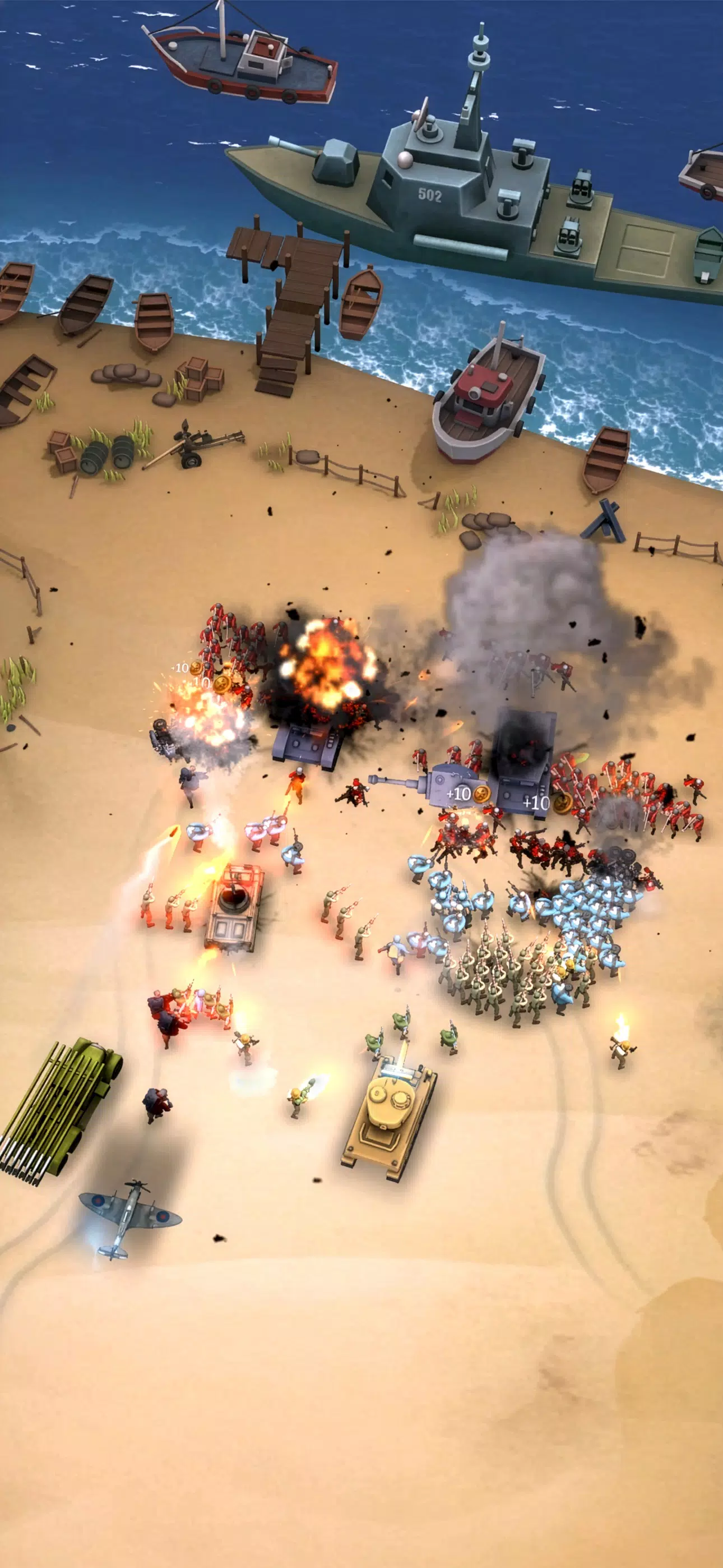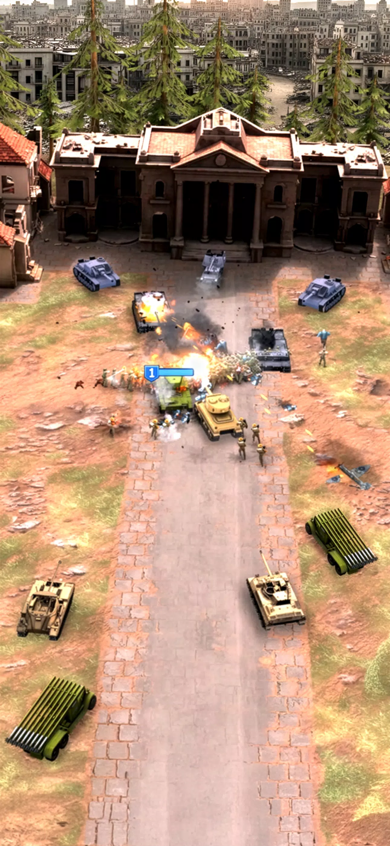 – 合并升级单位:拖拽合并相同的部队,即可立即解锁更强大的版本。坦克、狙击手、直升机和导弹卡车——每次合并,你的军队都会变得更加致命。